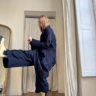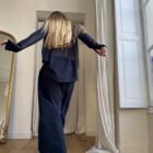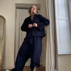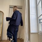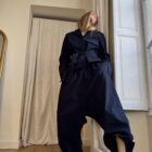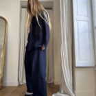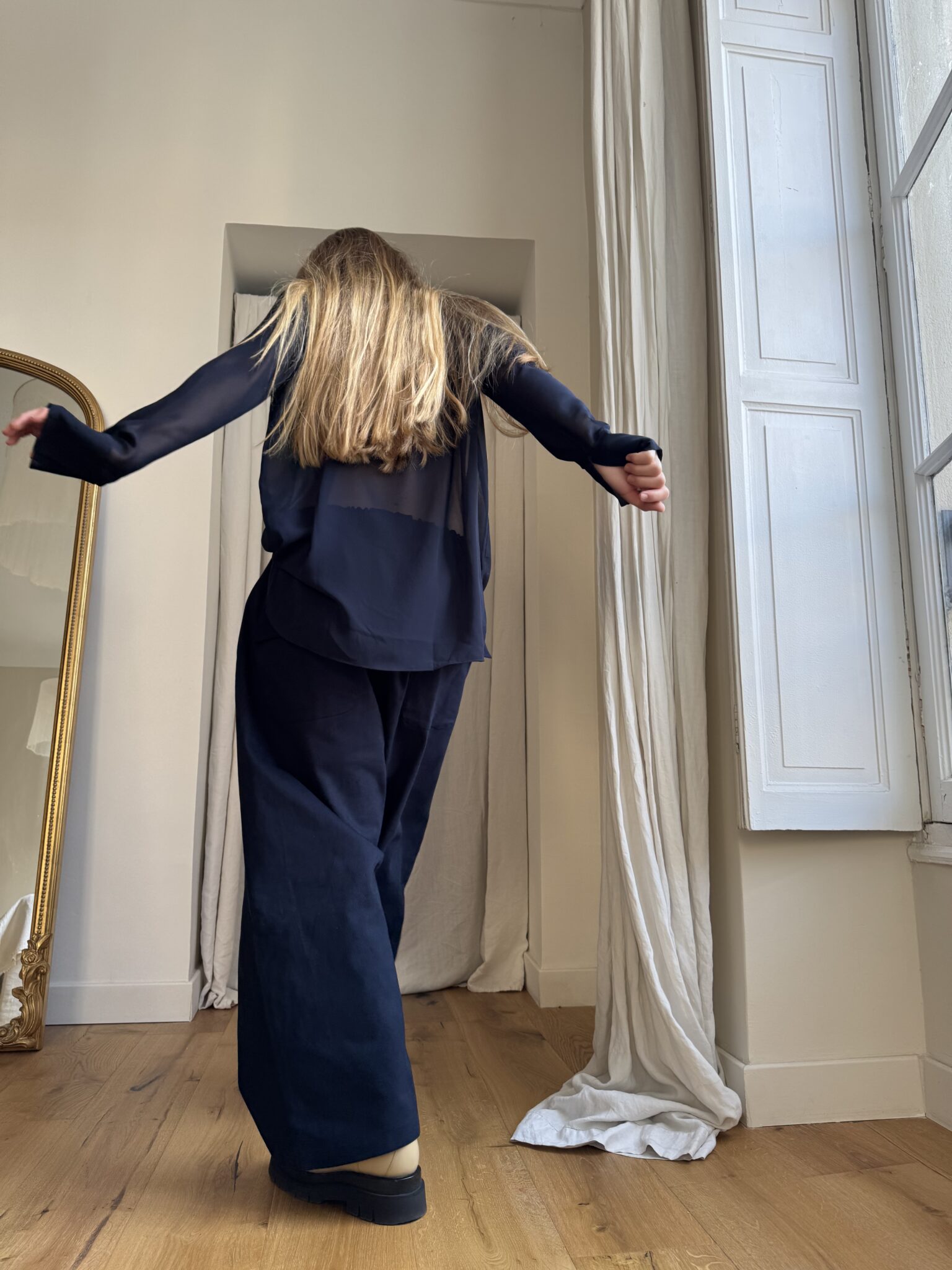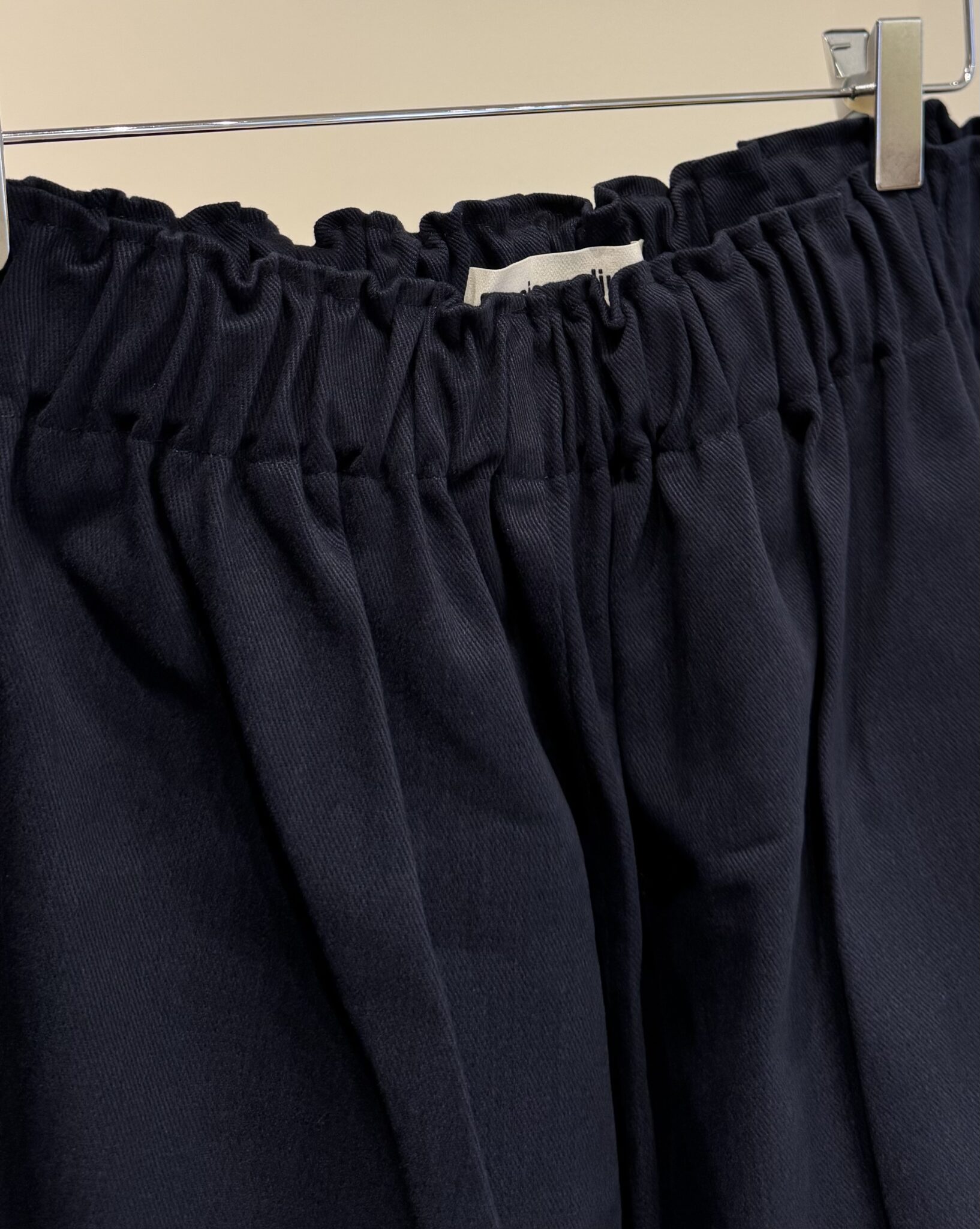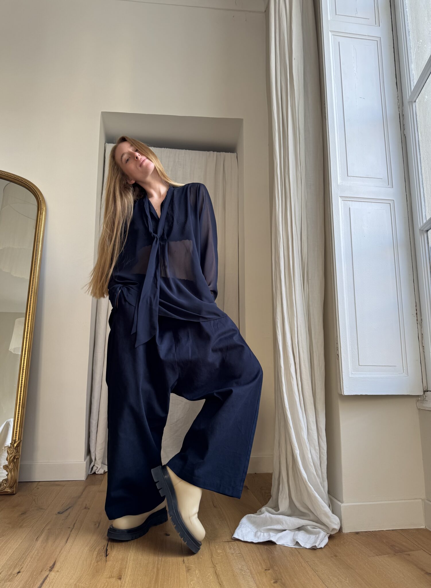 Pantalon « GASTON » en gabardine de coton bleu marine. Taille sur élastique, poches latérales. Poches plaquées à rabat au dos. Une coupe unisexe, oversize.