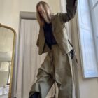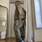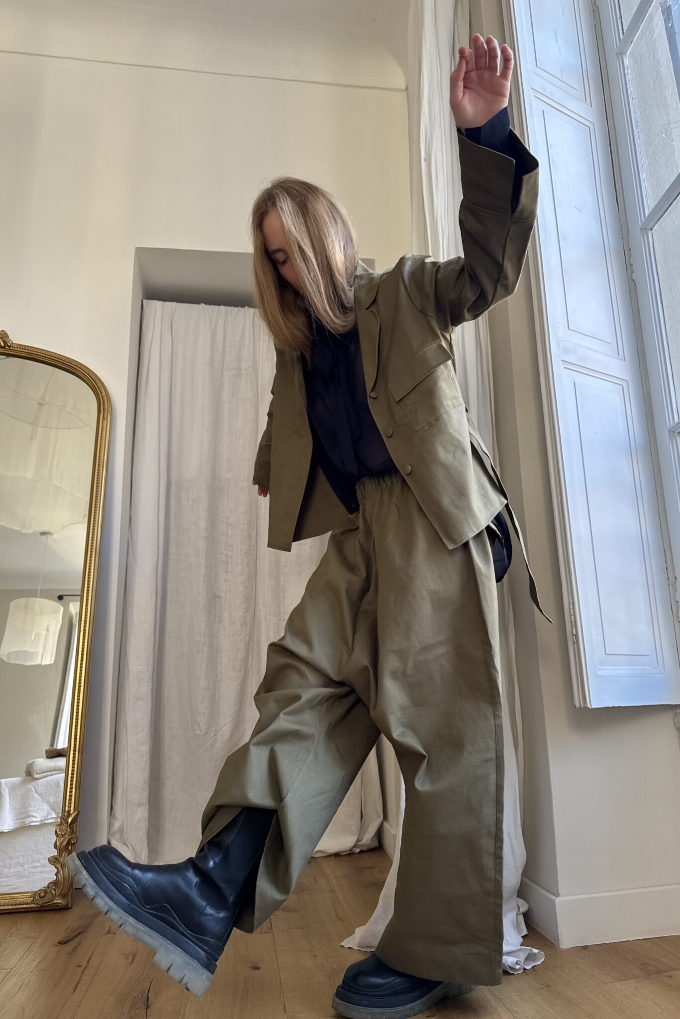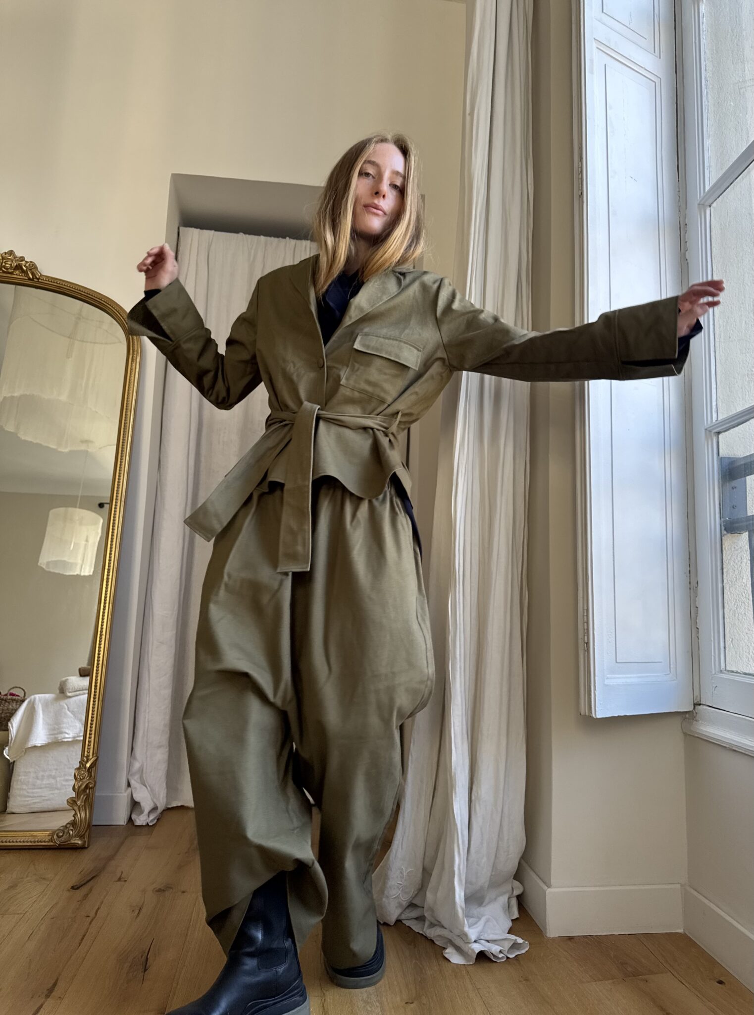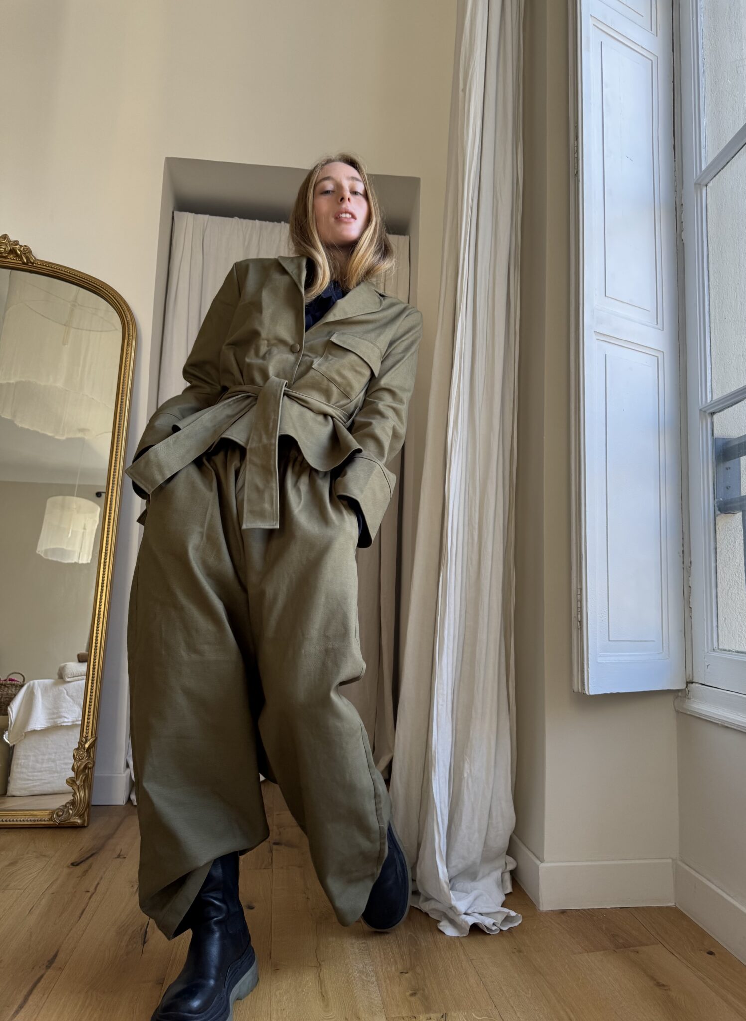 Pantalon « GASTON » en gabardine de coton kaki. Taille sur élastique, poches latérales. Poches plaquées à rabat au dos. Une coupe unisexe, oversize.
