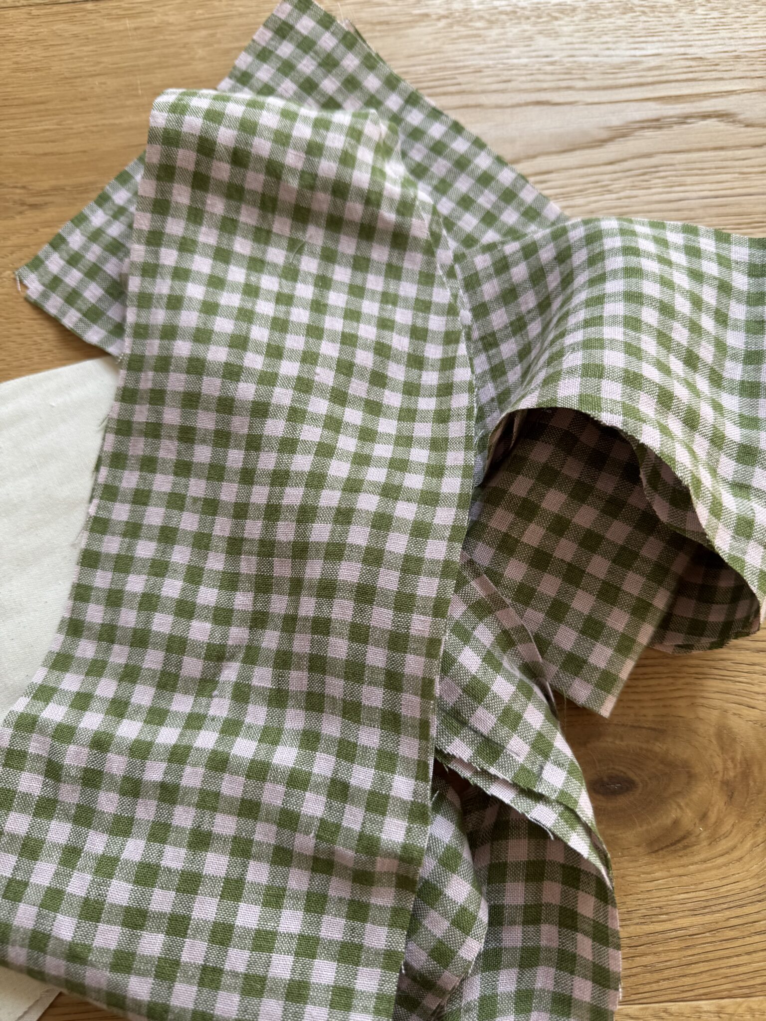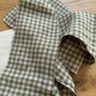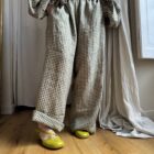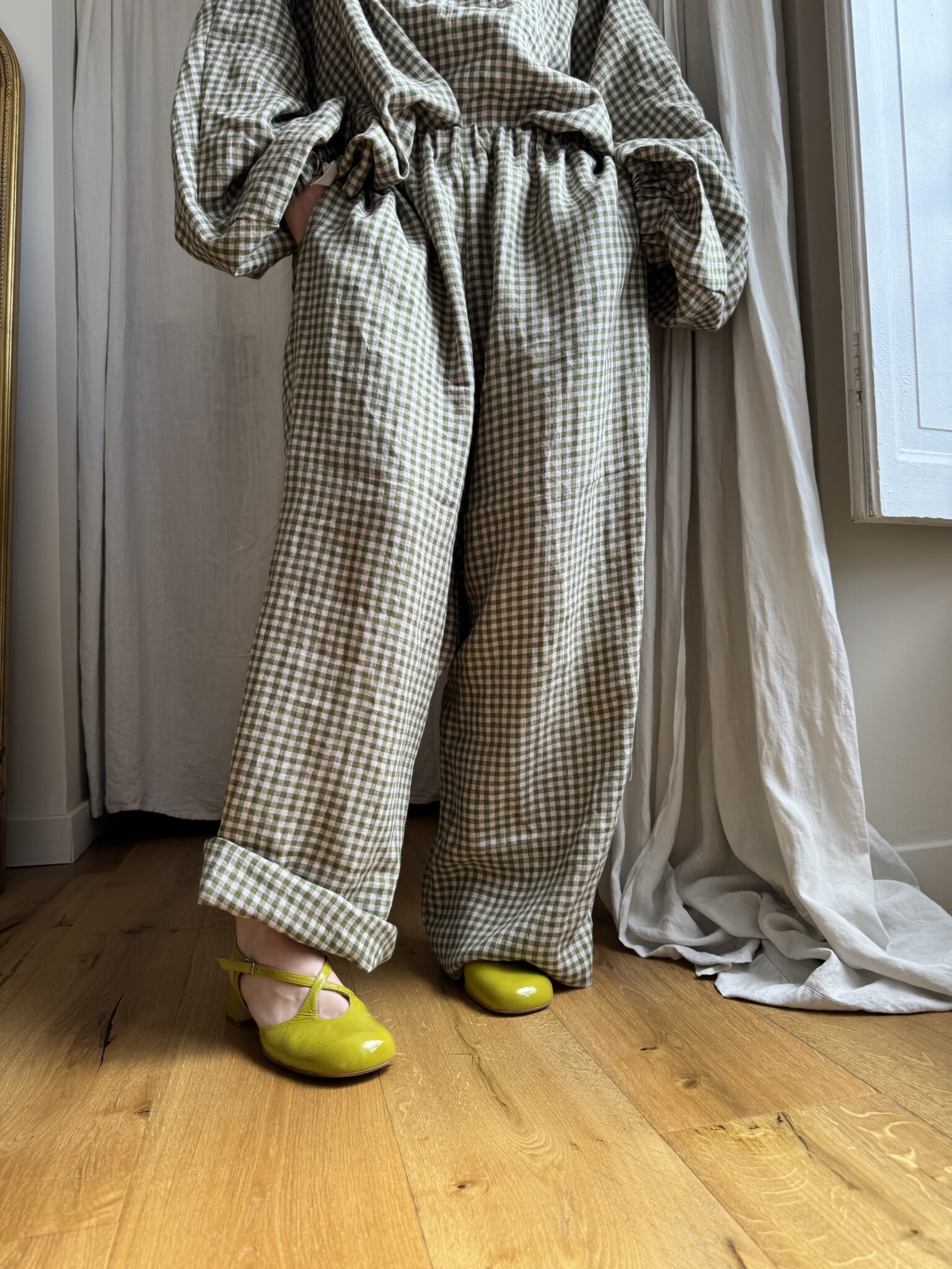 Pantalon « GASTON » en lin carreaux Vichy vert & rose pâle. Taille sur élastique, poches latérales. Une coupe loose.
