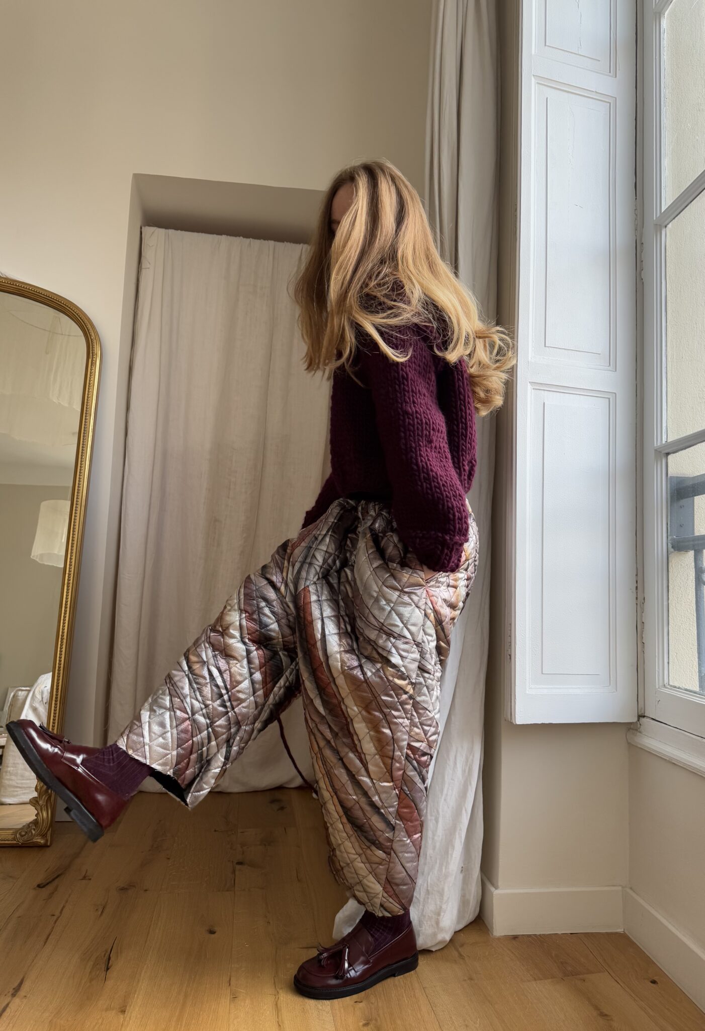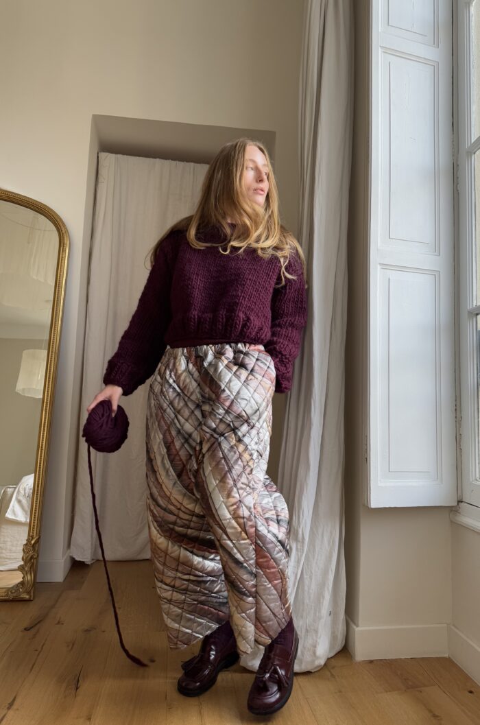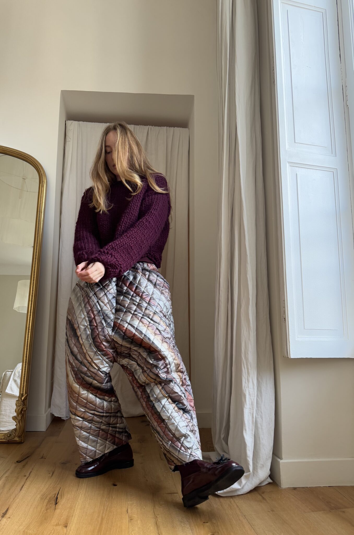 Pantalon « GASTON » dans un tissu métallisé à motifs. Taille sur élastique, poches latérales. Une coupe loose et oversize, pour un pantalon stylé et unique. PIÈCE UNIQUE