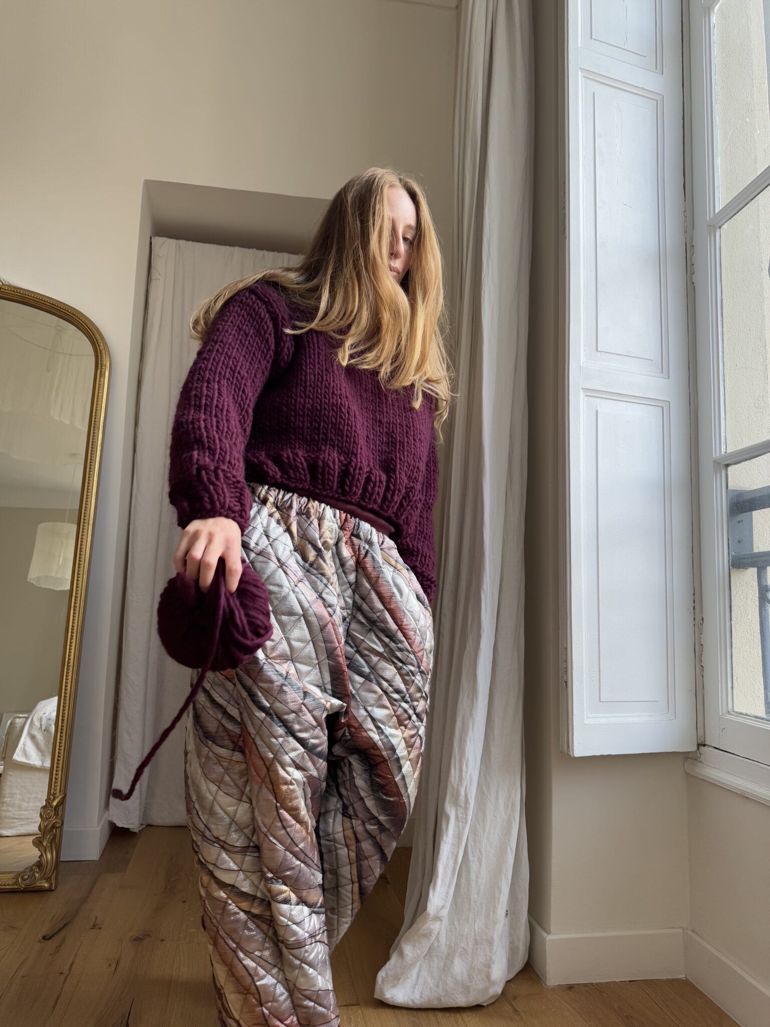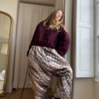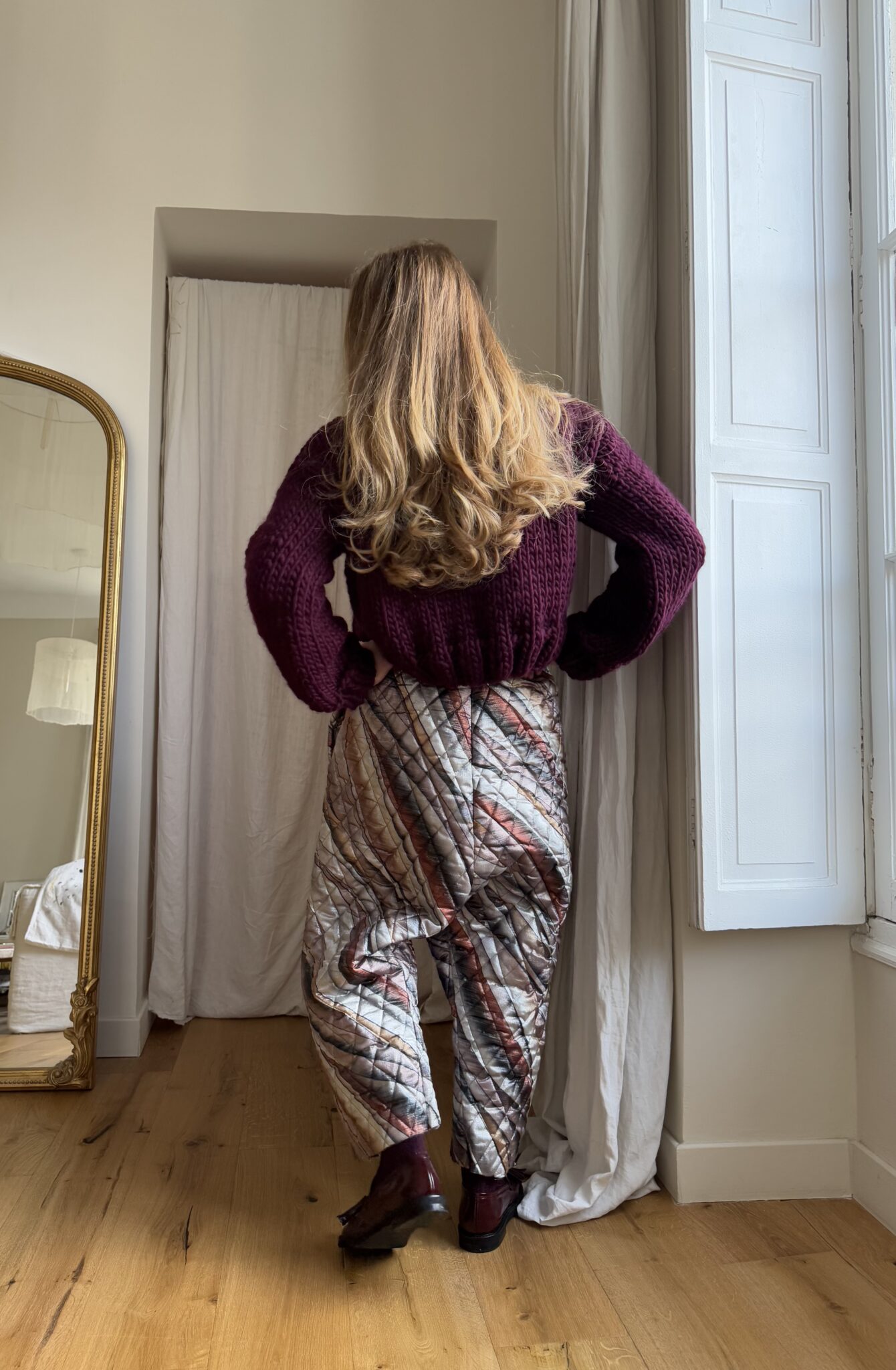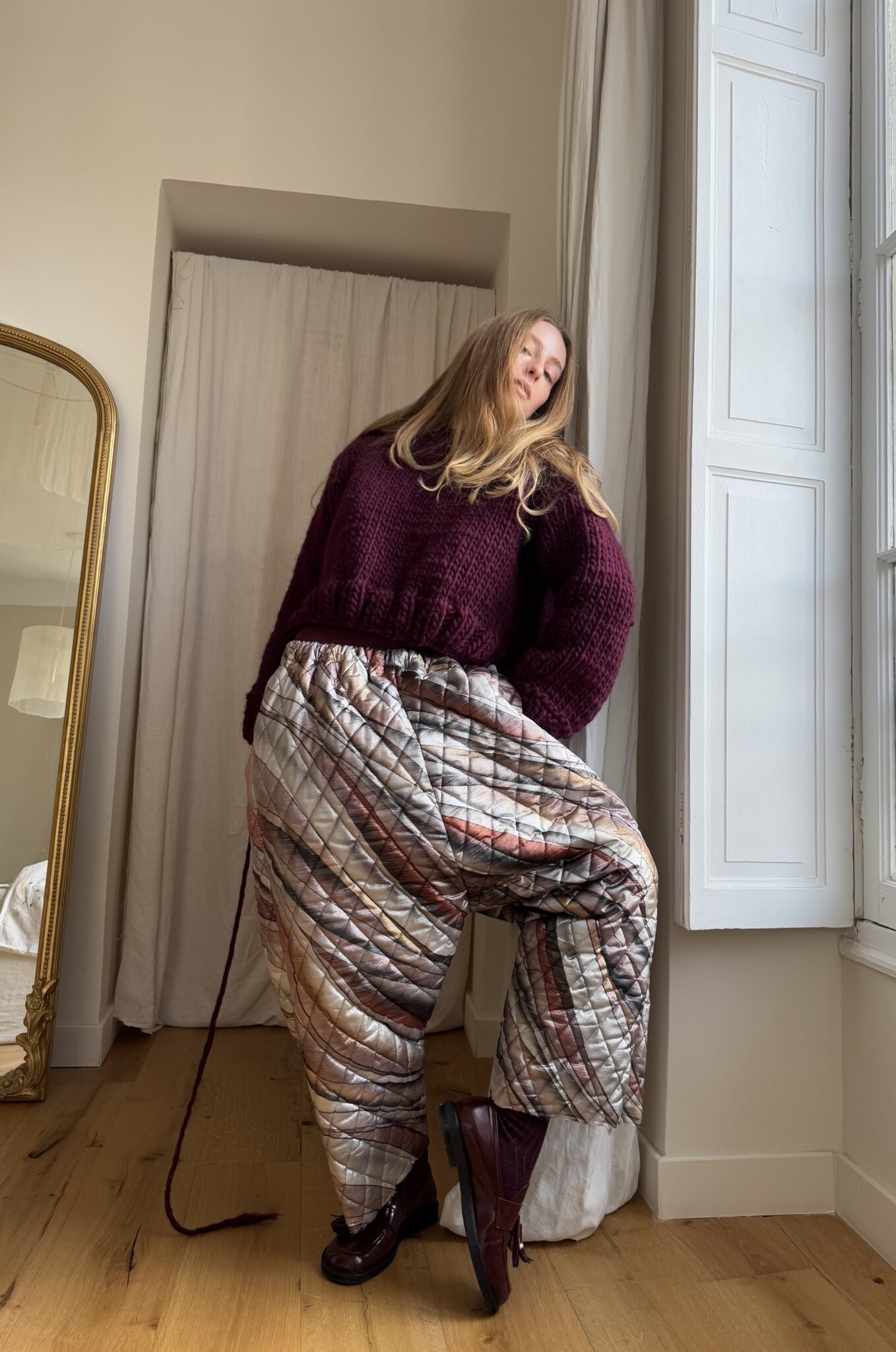 Pantalon « GASTON » dans un tissu métallisé à motifs. Taille sur élastique, poches latérales. Une coupe loose et oversize, pour un pantalon stylé et unique. PIÈCE UNIQUE
