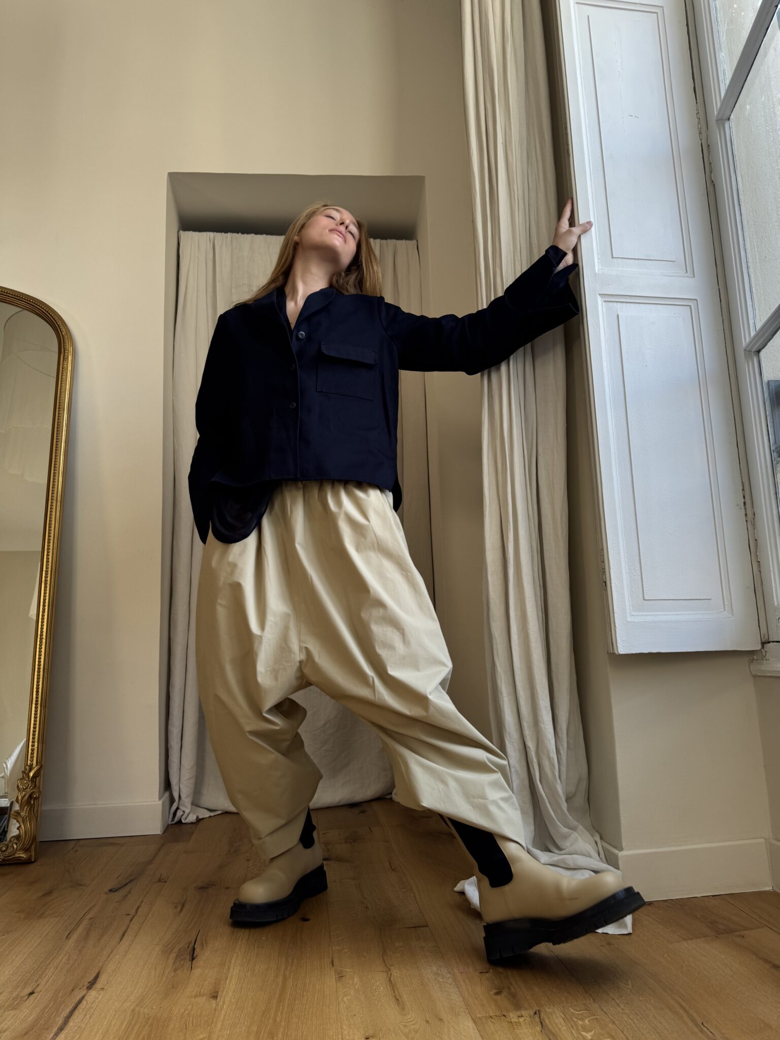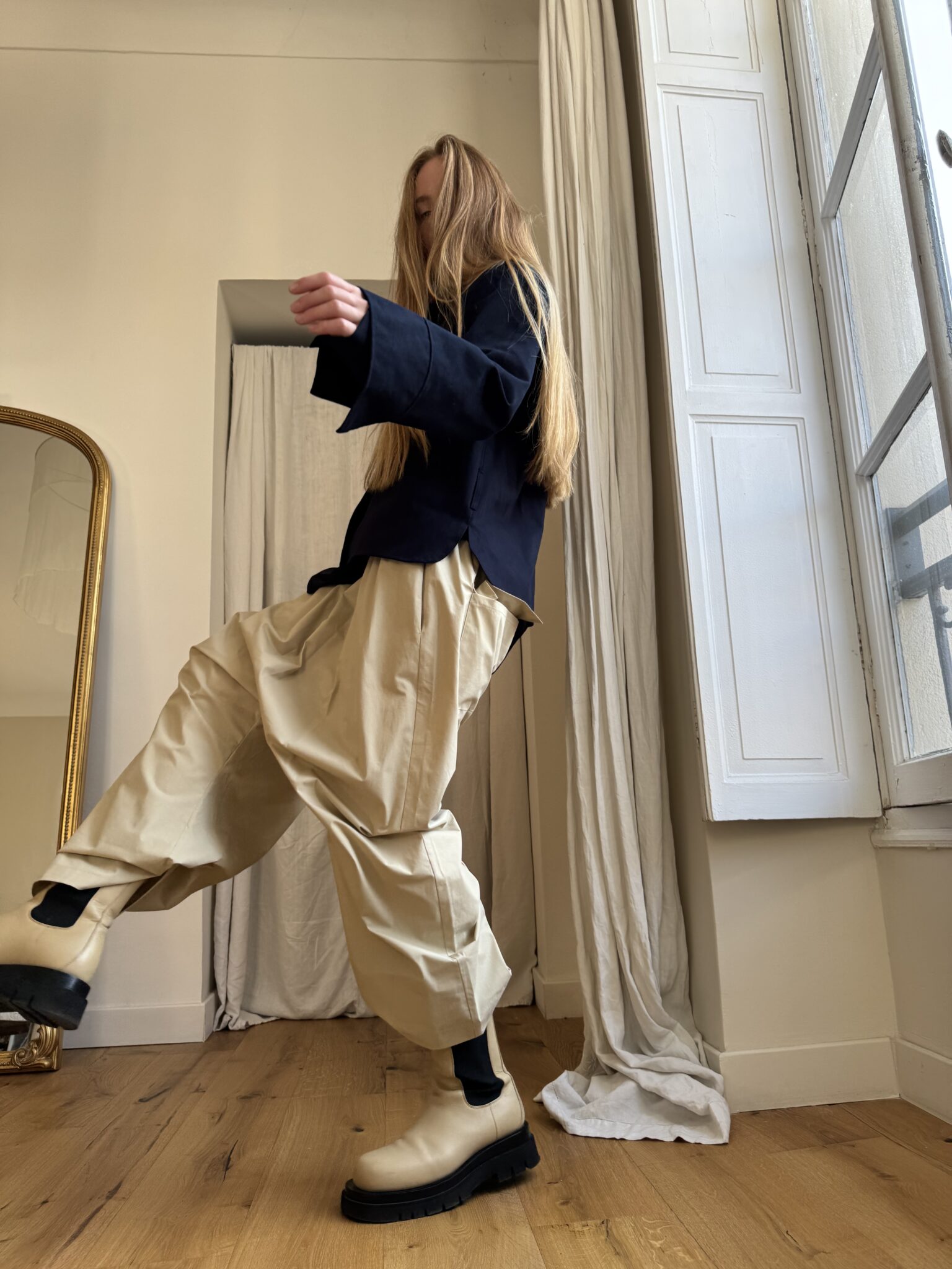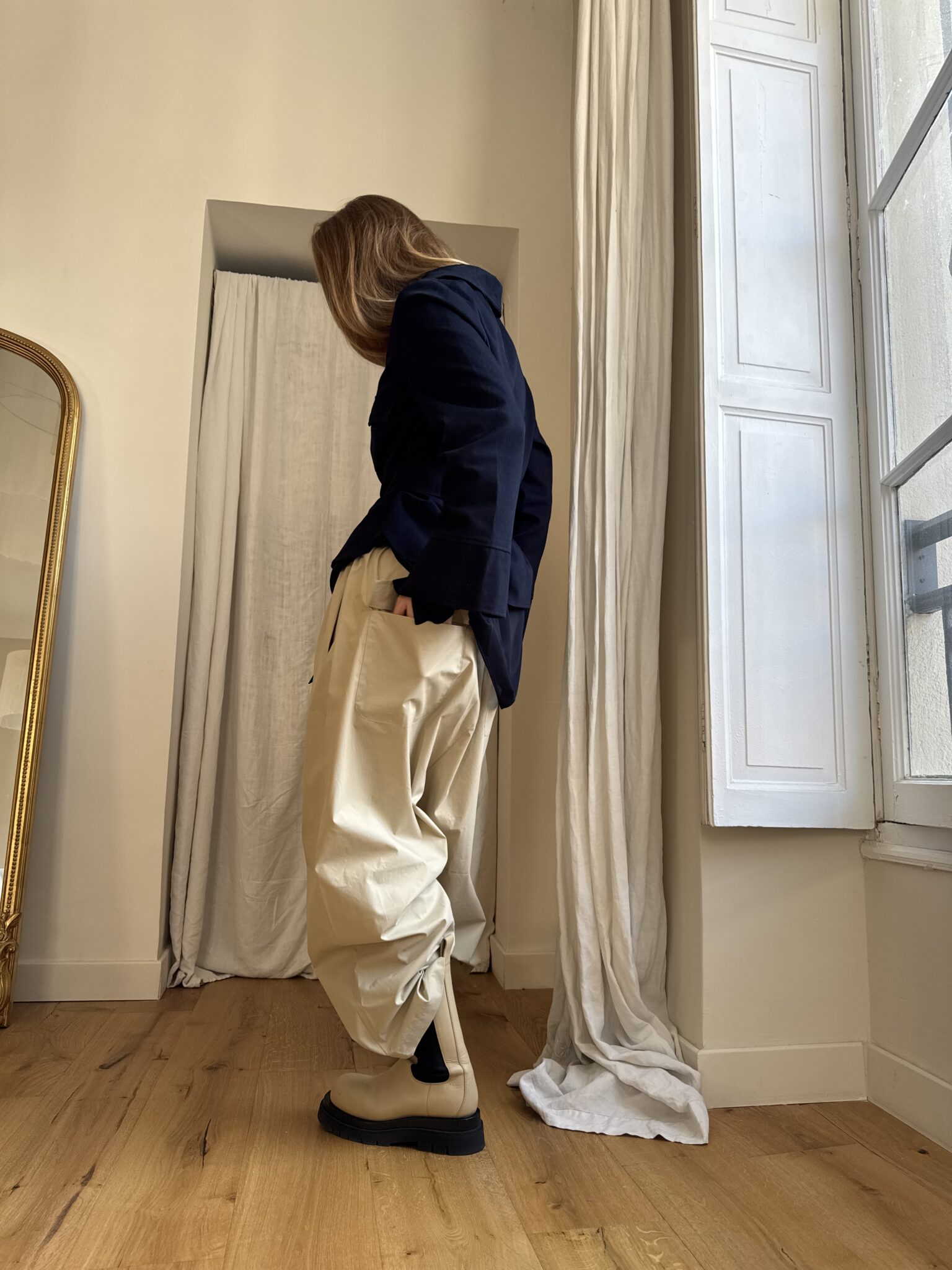 Pantalon « GASTON » en popeline de coton sable. Taille sur élastique, poches latérales. Poches plaquées à rabat au dos. Une coupe unisexe, oversize.