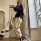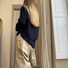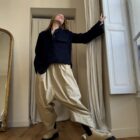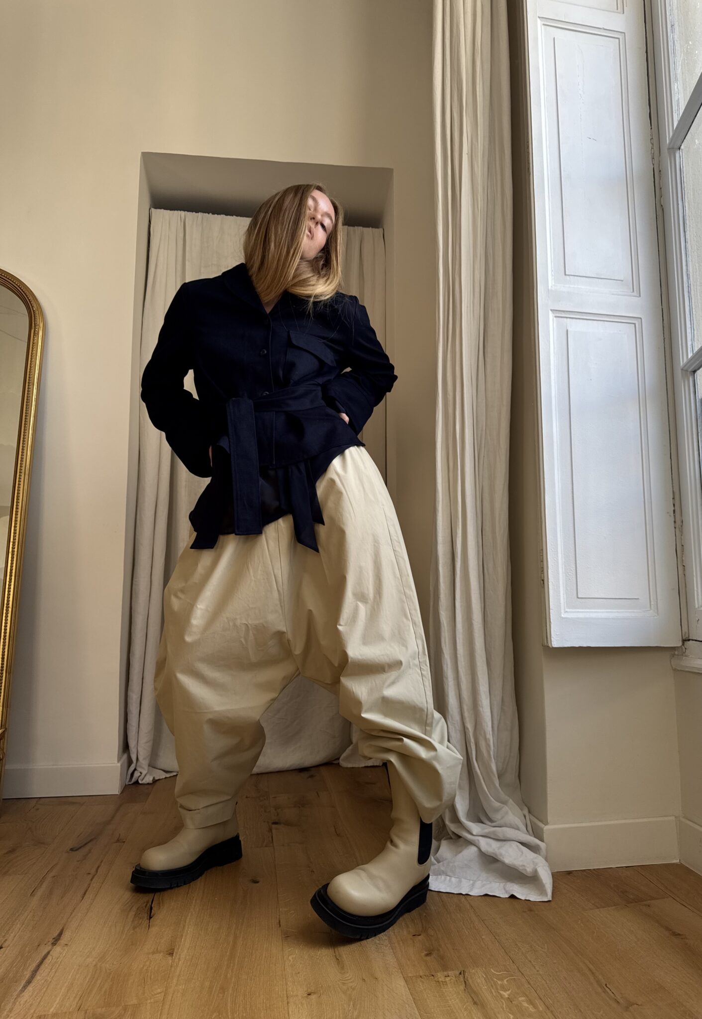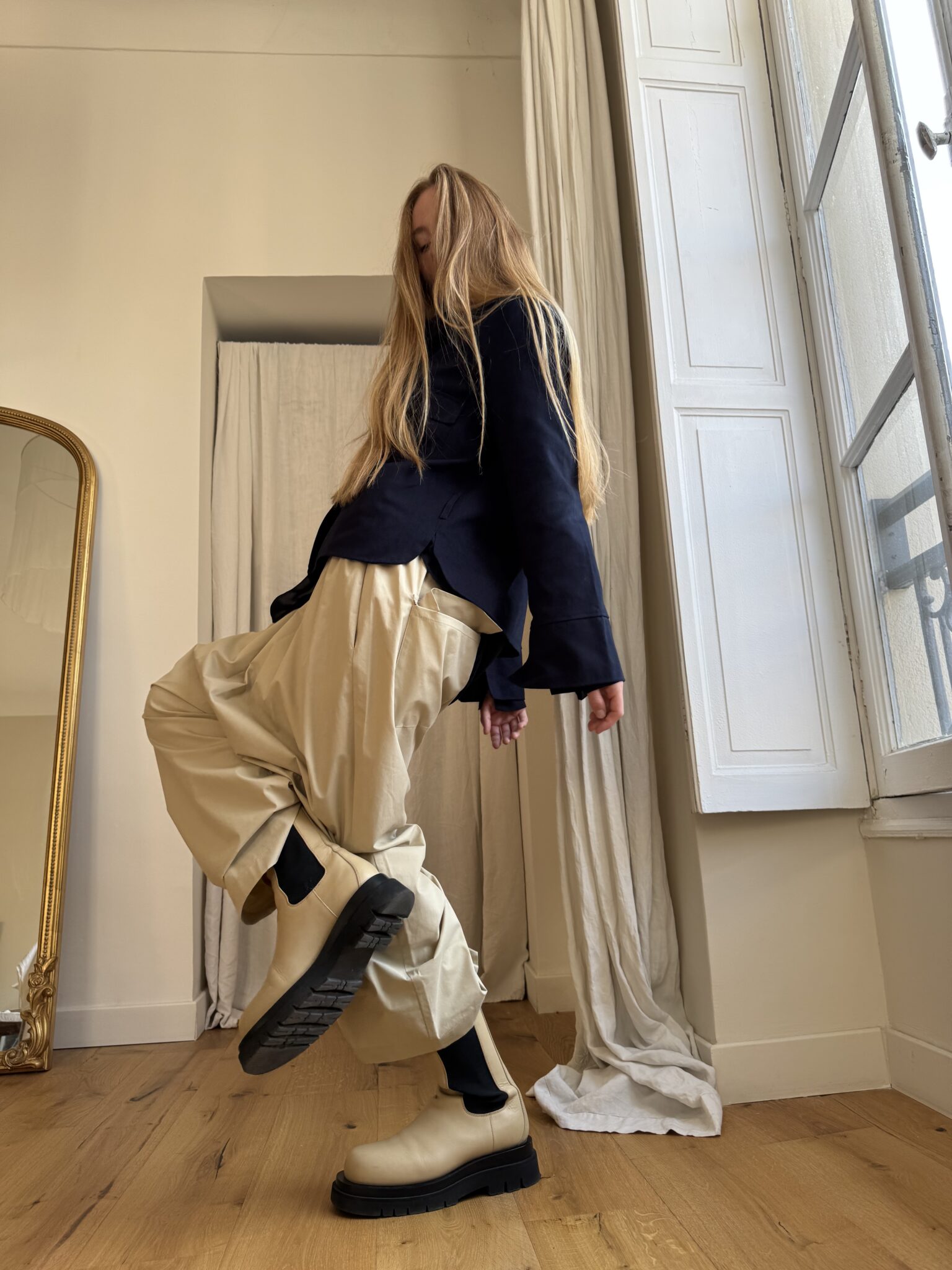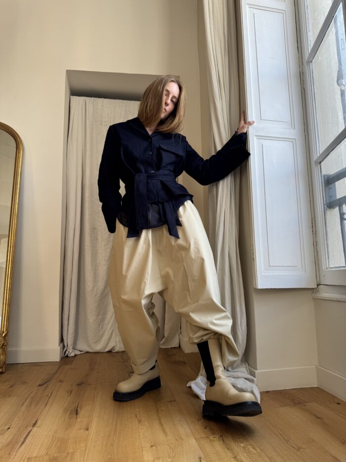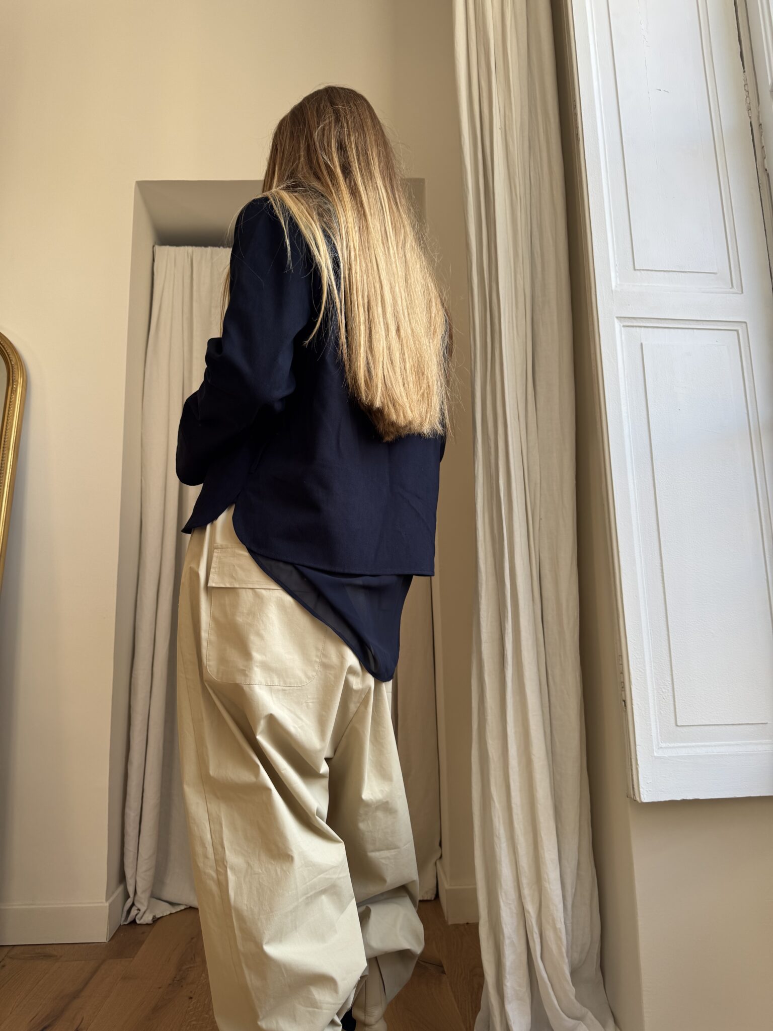 Pantalon « GASTON » en popeline de coton sable. Taille sur élastique, poches latérales. Poches plaquées à rabat au dos. Une coupe unisexe, oversize.