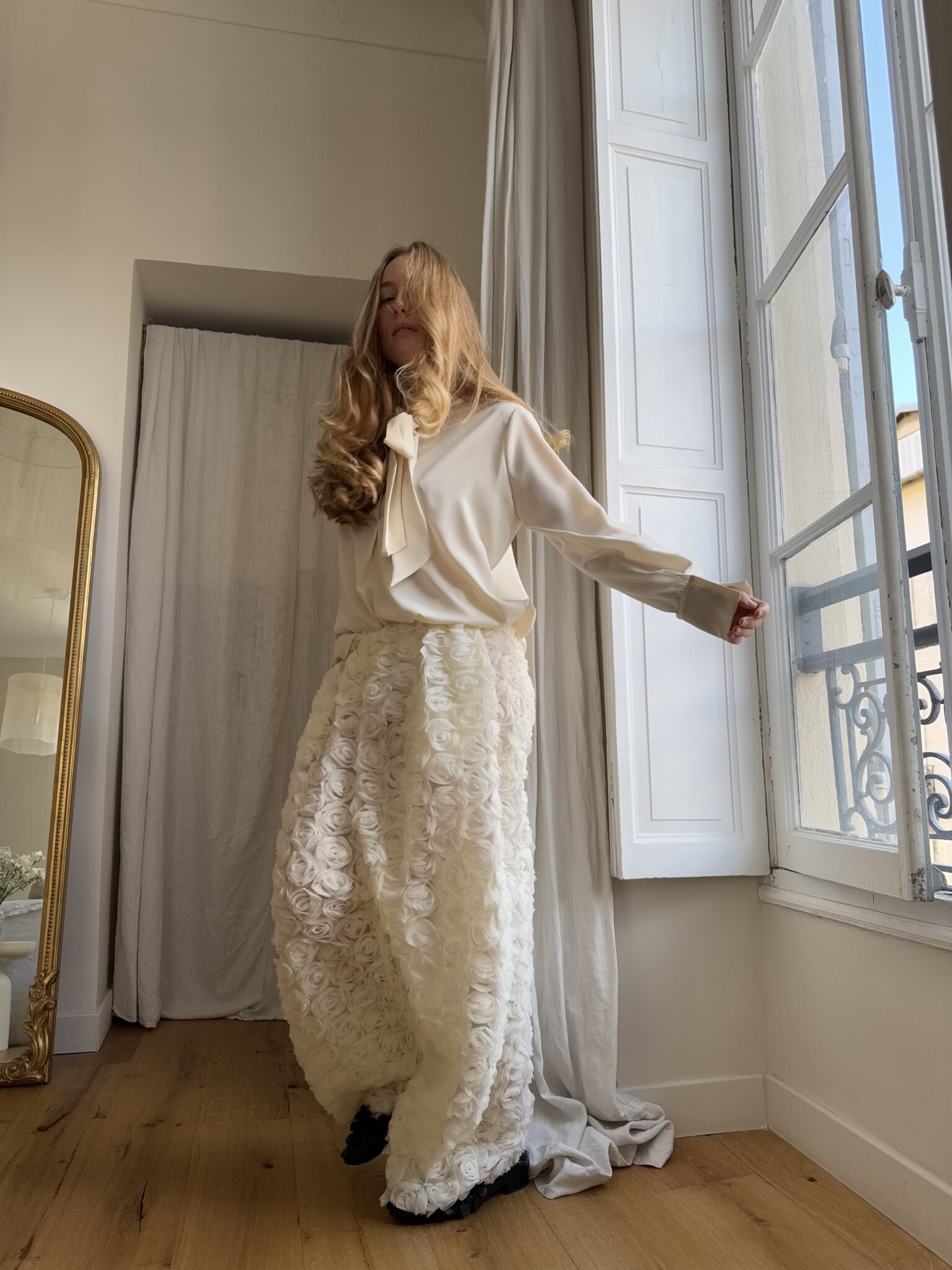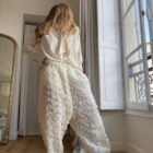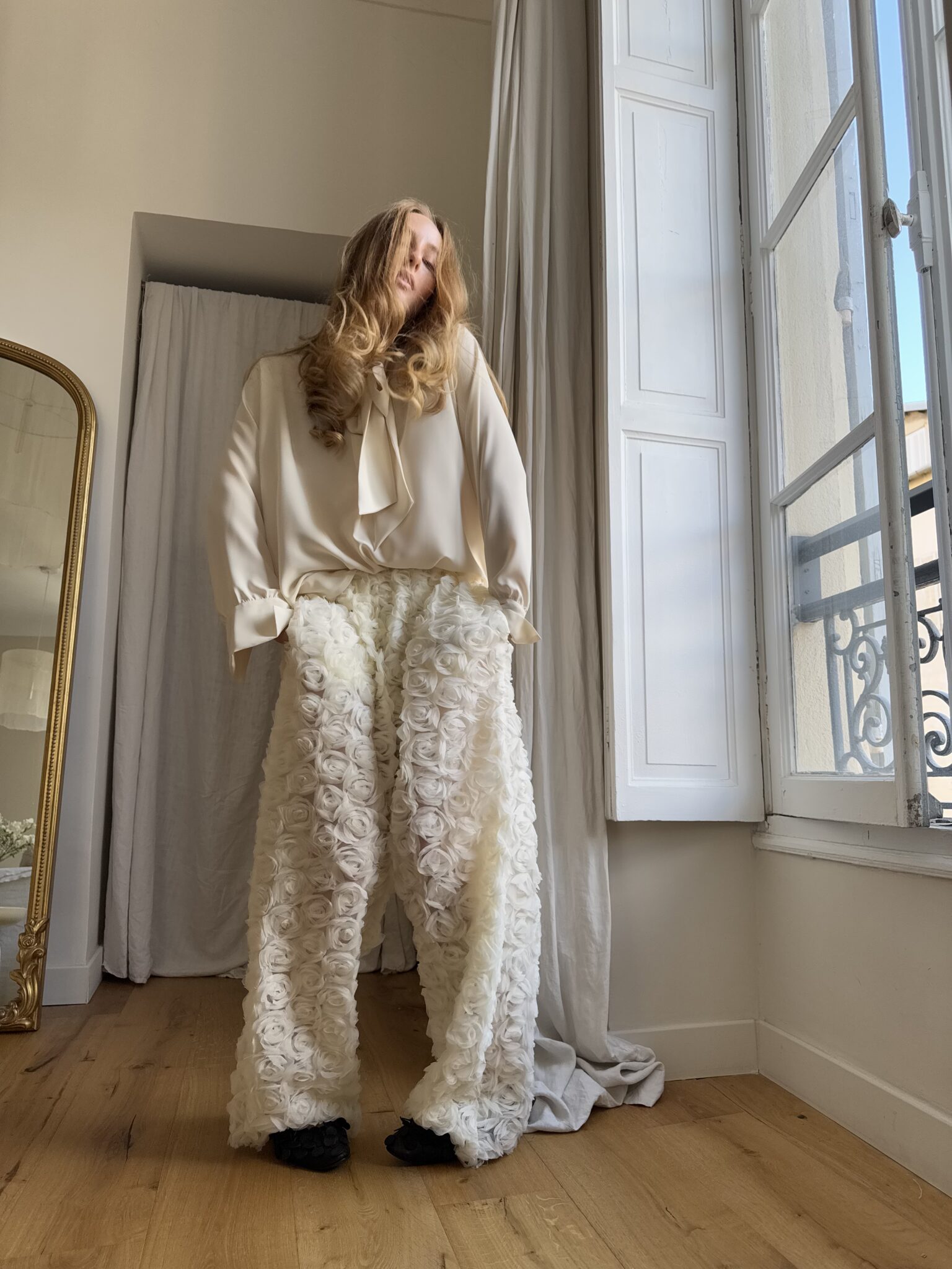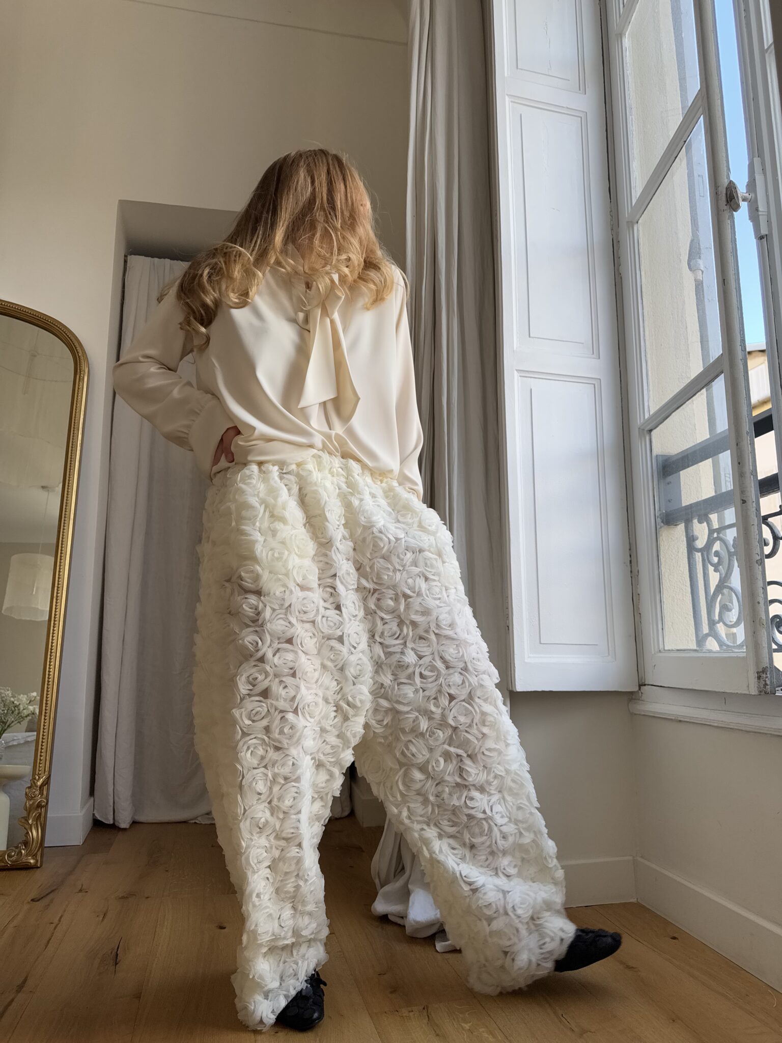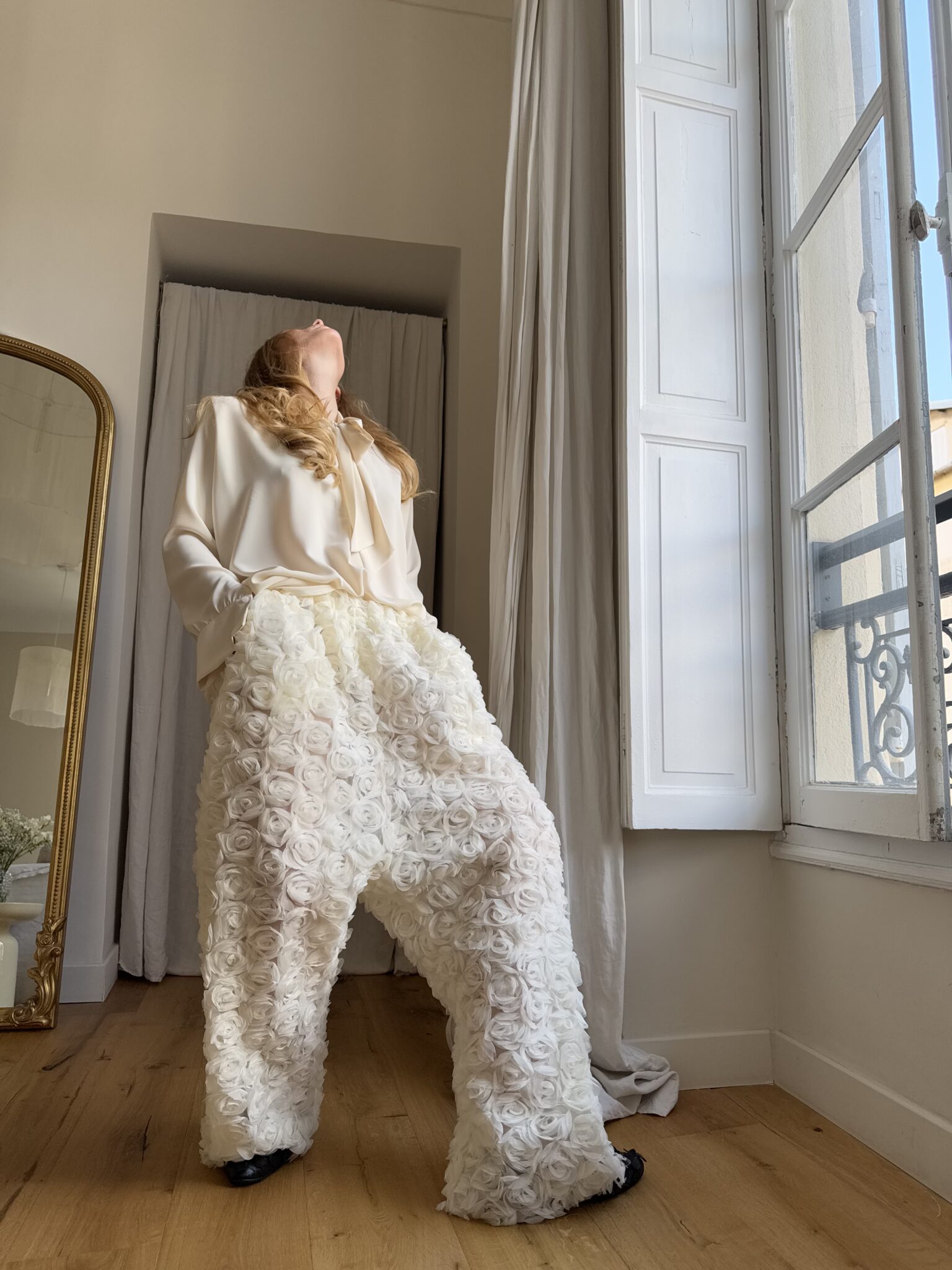 Pantalon « GASTON » dans un sublime tulle orné de roses. Taille sur élastique, poches latérales. Une coupe loose et oversize, pour un pantalon stylé et unique. PIÈCE UNIQUE