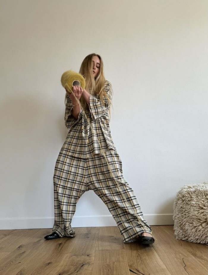 Pantalon « GASTON » dans un sublime tartan stretch en lin et viscose. Une coupe loose et minimaliste, style japonisant, fond de pantalon bas, poches, taille sur élastique, une pièce stylée et unique.