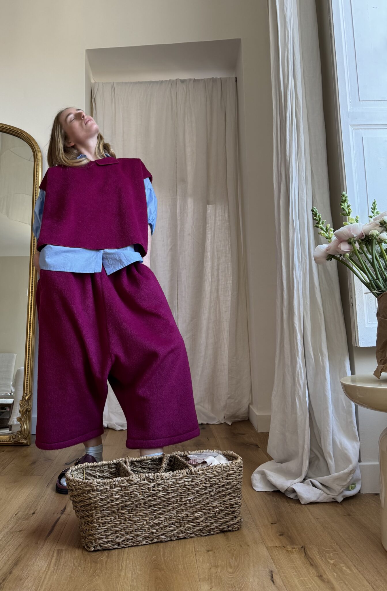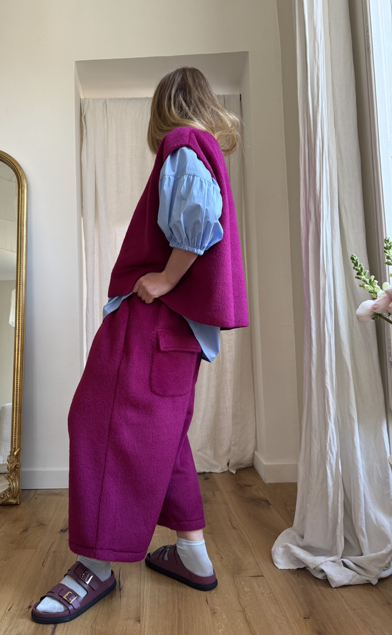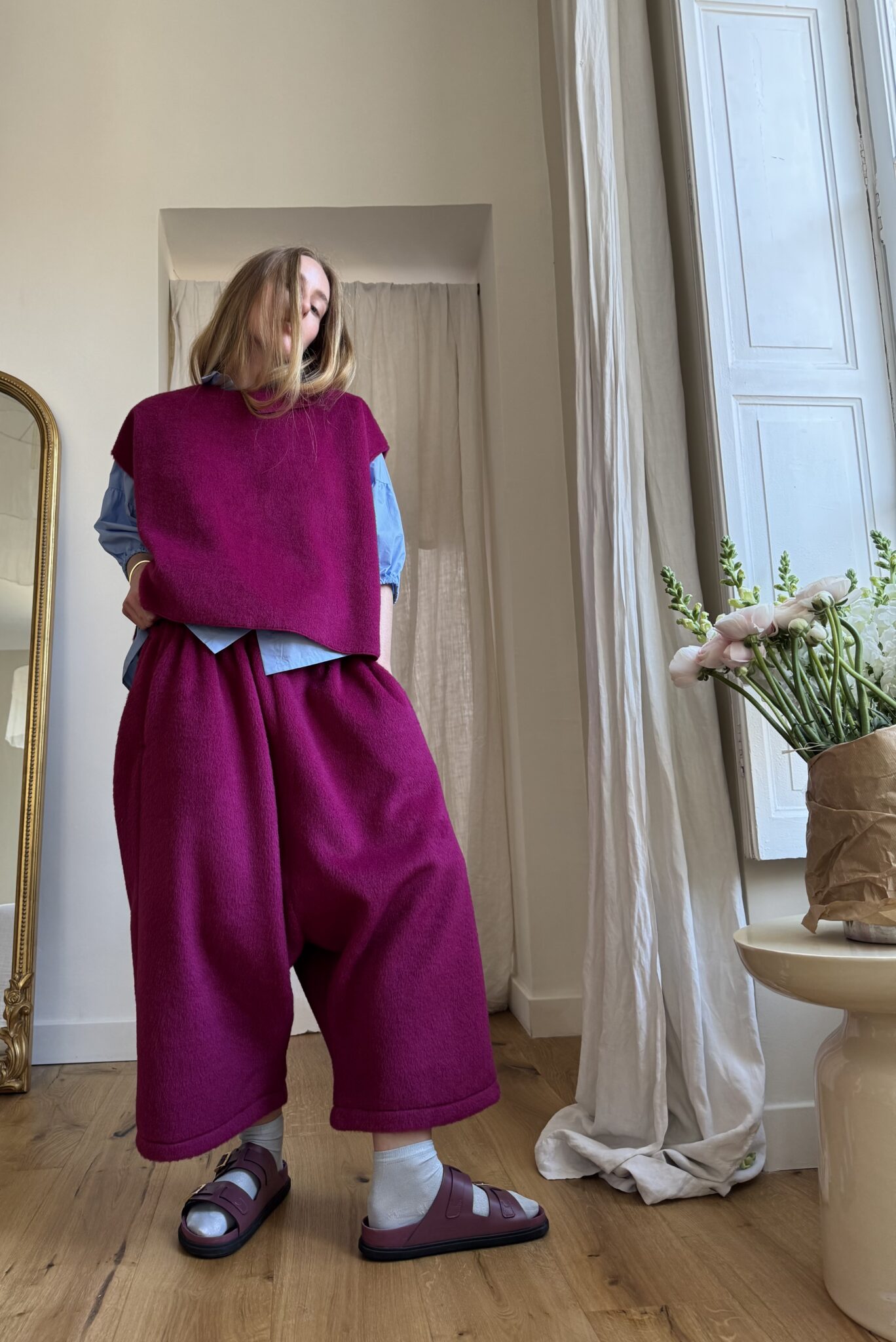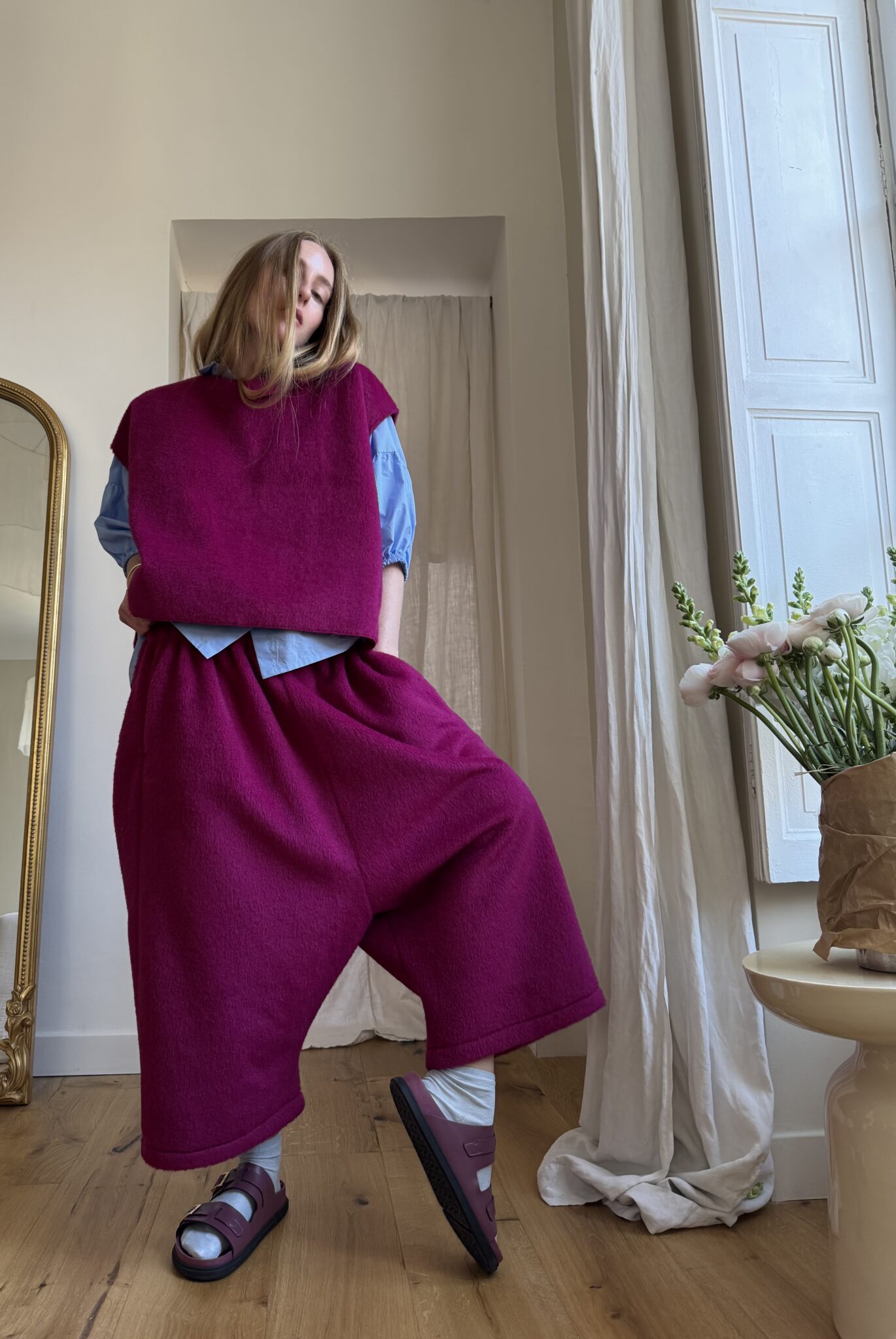 Pantalon « GASTON » tissu laineux framboise. Taille sur élastique, poches latérales. Poches plaquées à rabat au dos. Une coupe unisexe, oversize.