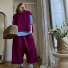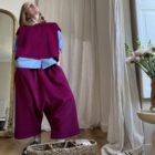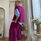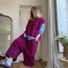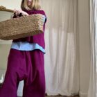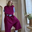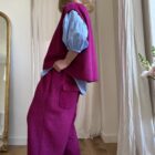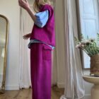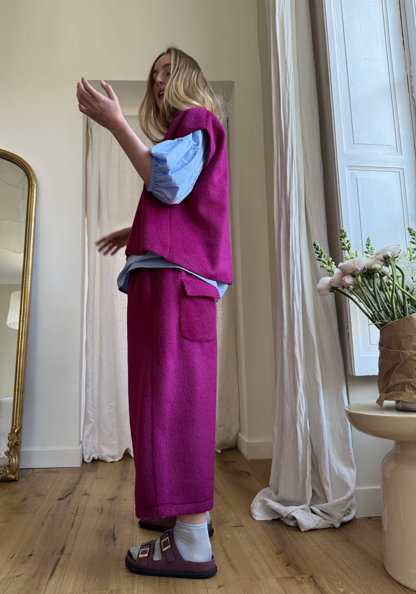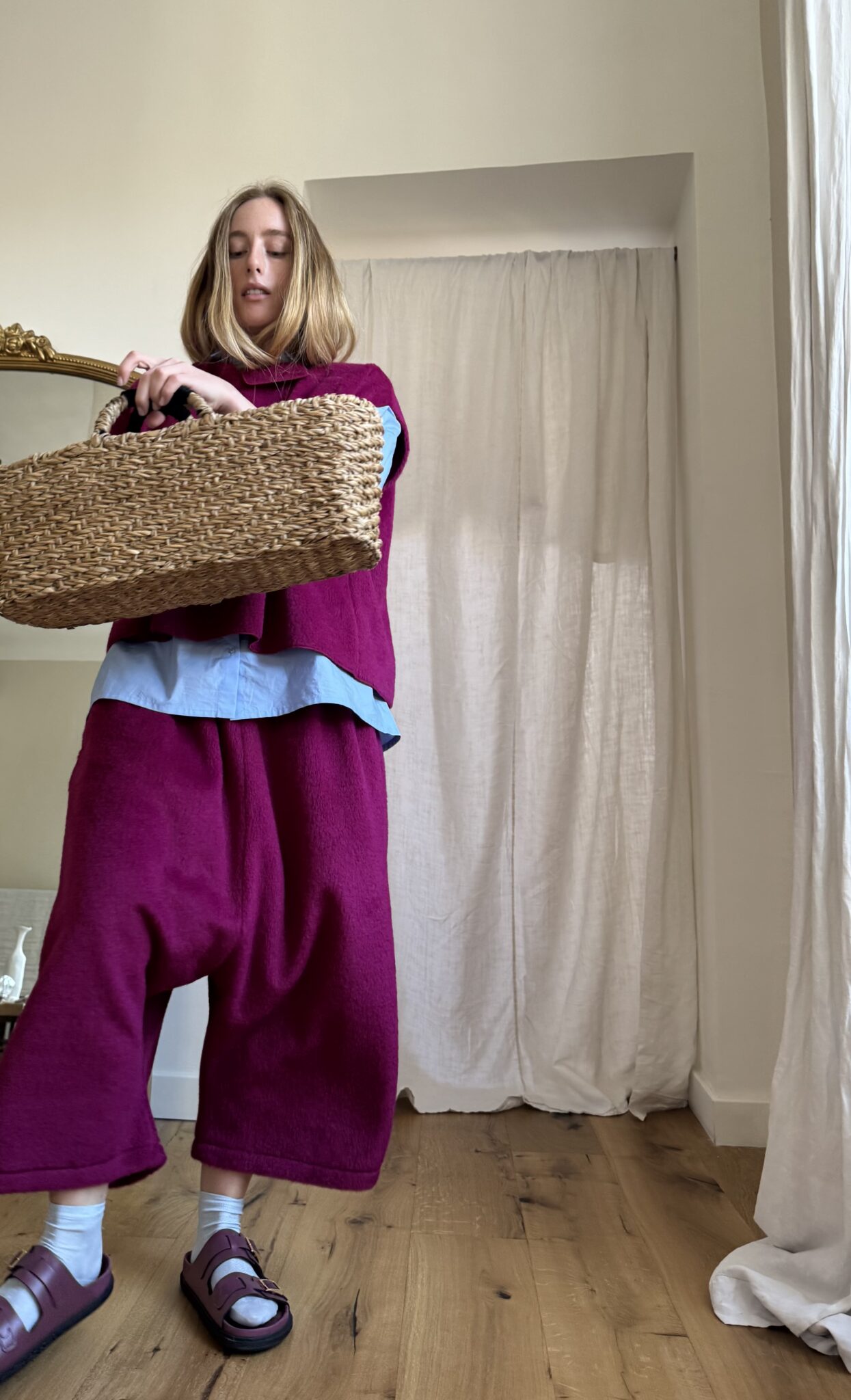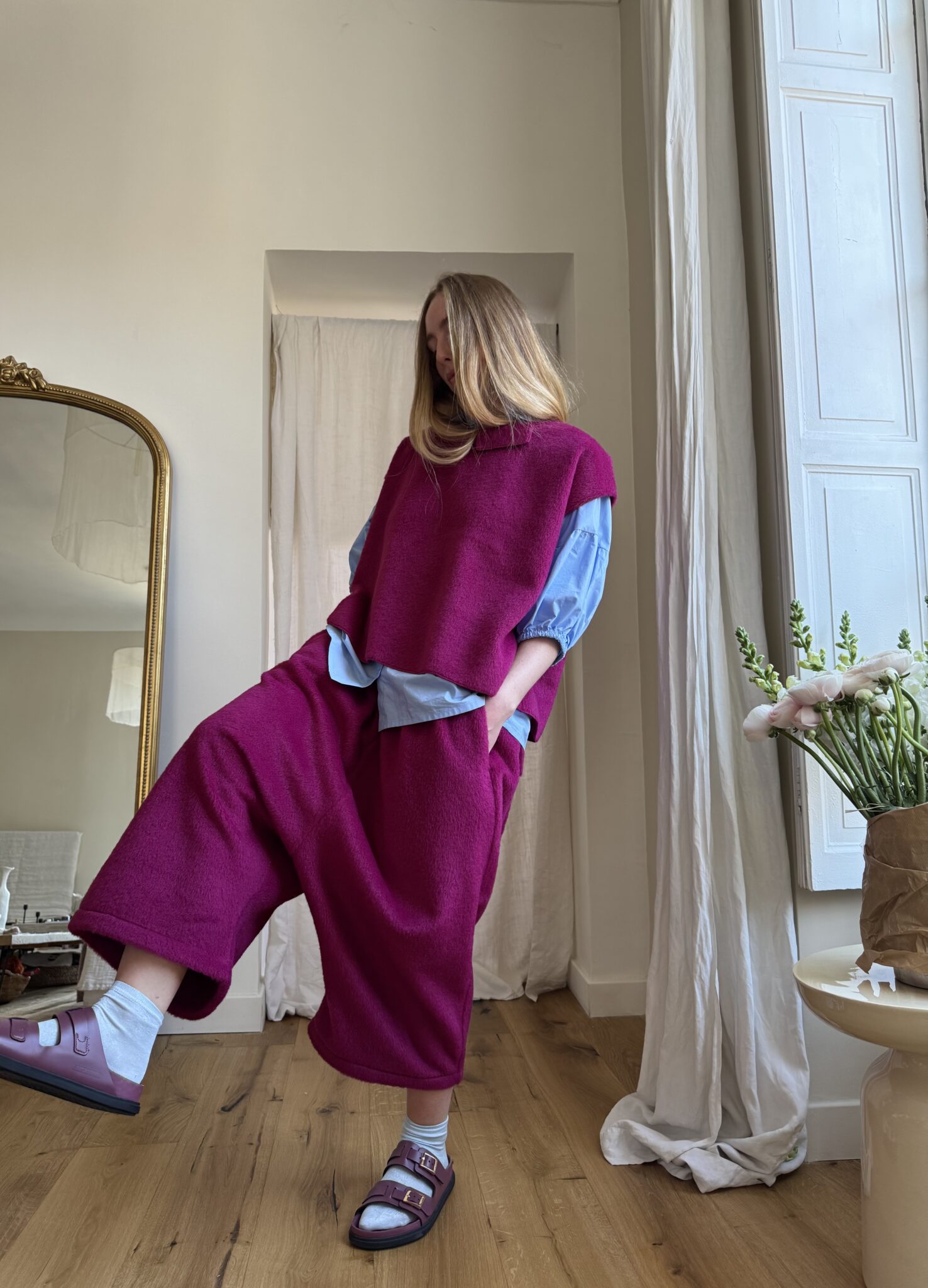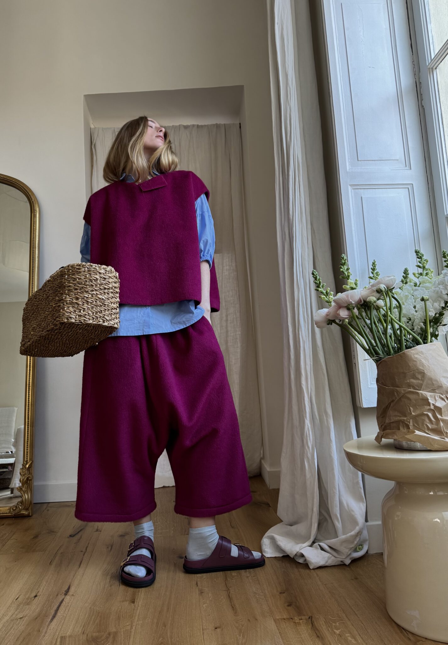 Pantalon « GASTON » tissu laineux framboise. Taille sur élastique, poches latérales. Poches plaquées à rabat au dos. Une coupe unisexe, oversize.