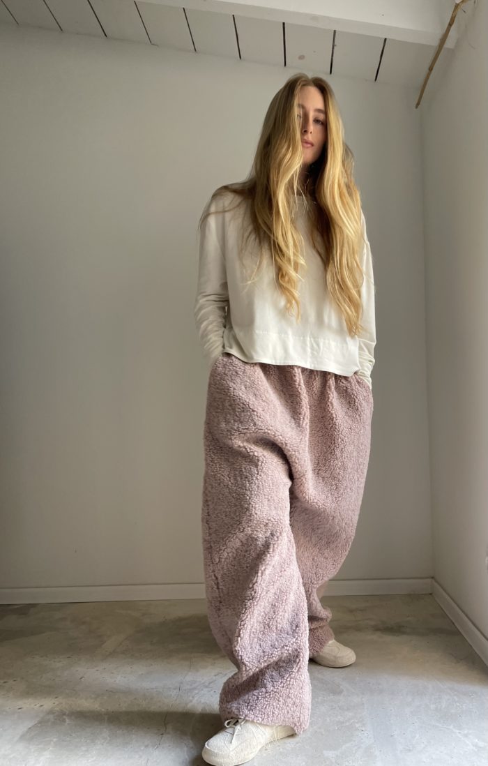 Pantalon « JO » en bouclettes roses, taille sur élastique, poches latérales. Une coupe loose et oversize, pour un pantalon dégaine et unique.