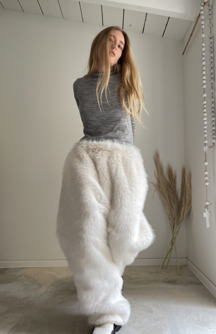 Pantalon « JO » en fausse fourrure écru, taille sur élastique, poches latérales. Une coupe loose et oversize, pour un pantalon stylé et unique.