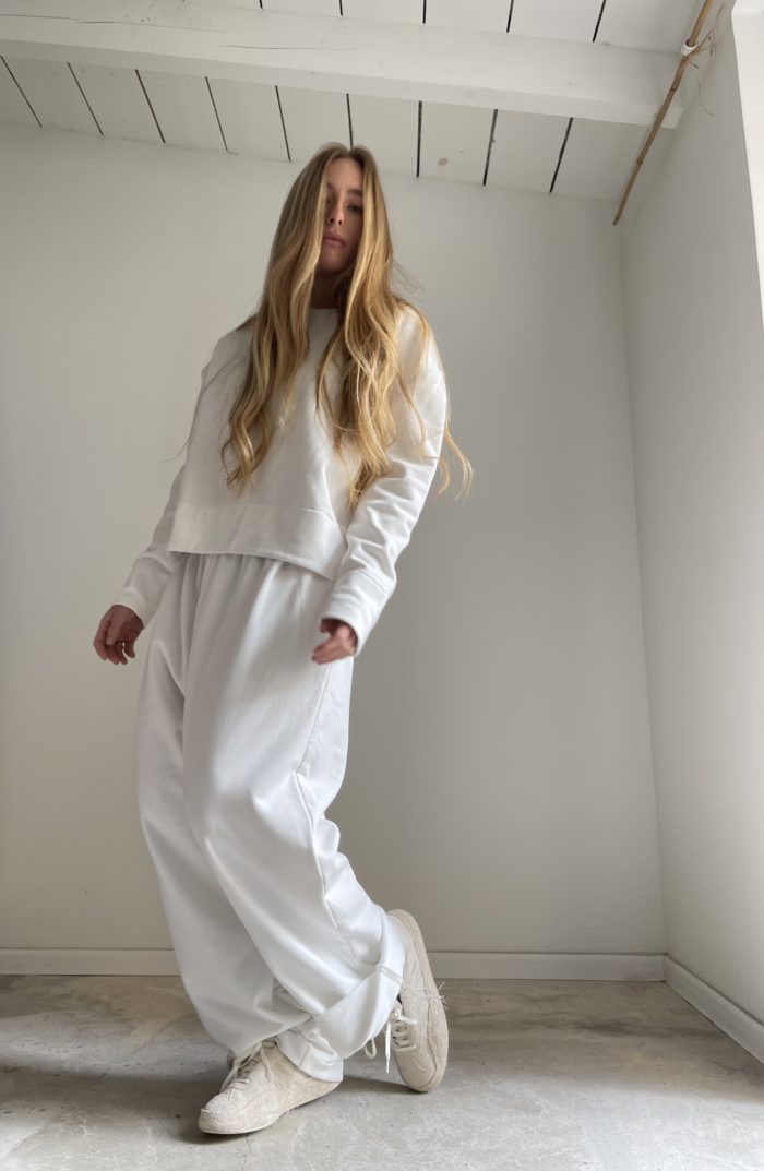 Pantalon « JO » en coton molleton écru envers gratté, taille sur élastique, poches latérales. Une coupe unisexe, loose et oversize, pour un pantalon jogging dégaine et unique.