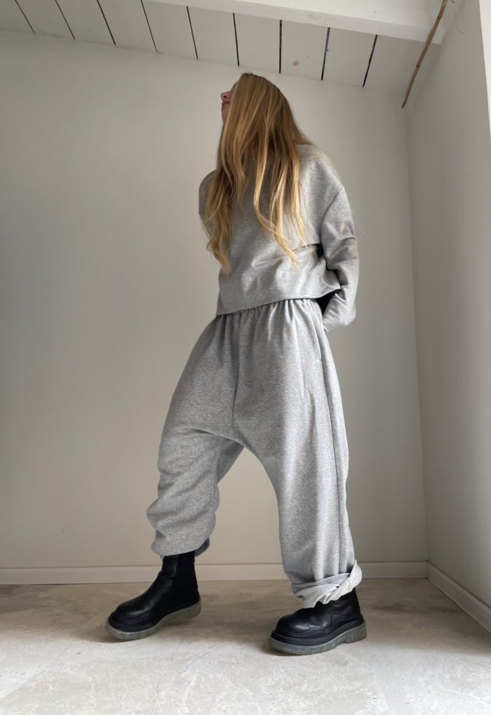 Pantalon « JO » en coton molleton gris envers gratté, taille sur élastique, poches latérales. Une coupe unisexe, loose et oversize, pour un pantalon jogging dégaine et unique.