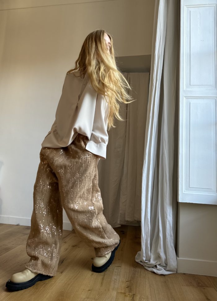 Pantalon « JO » dans un sublime lainage à sequins. Taille sur élastique, poches latérales. Une coupe loose et oversize, pour un pantalon stylé et unique. 1 seul et UNIQUE exemplaire.