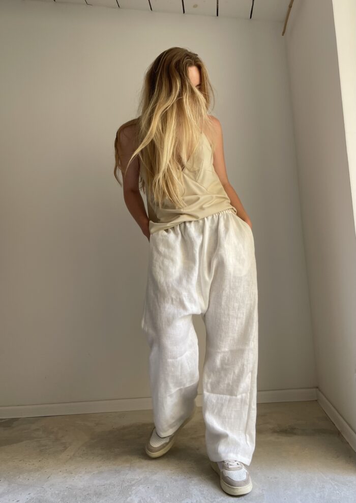 Pantalon « JO » dans un magnifique lin écru. Une coupe loose, taille élastiquée, poches latérales. La coupe parfaite !