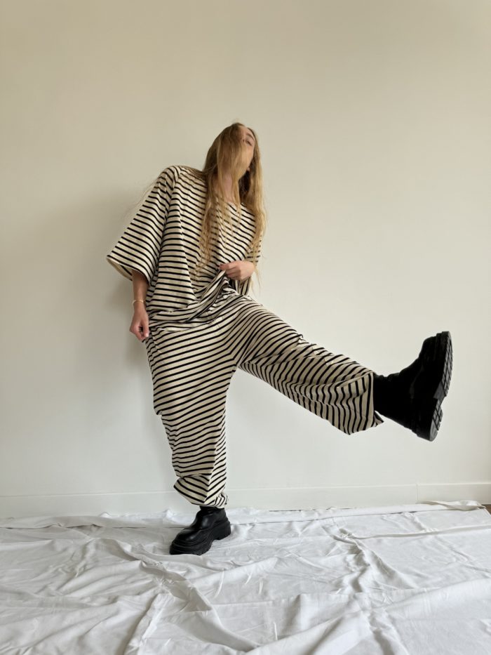 Pantalon « JO » dans un sublime jersey coton & laine marinière. Rayures noires sur fond écru. Taille sur élastique, poches latérales. Une coupe loose et oversize, pour un pantalon stylé et unique. Petite édition.