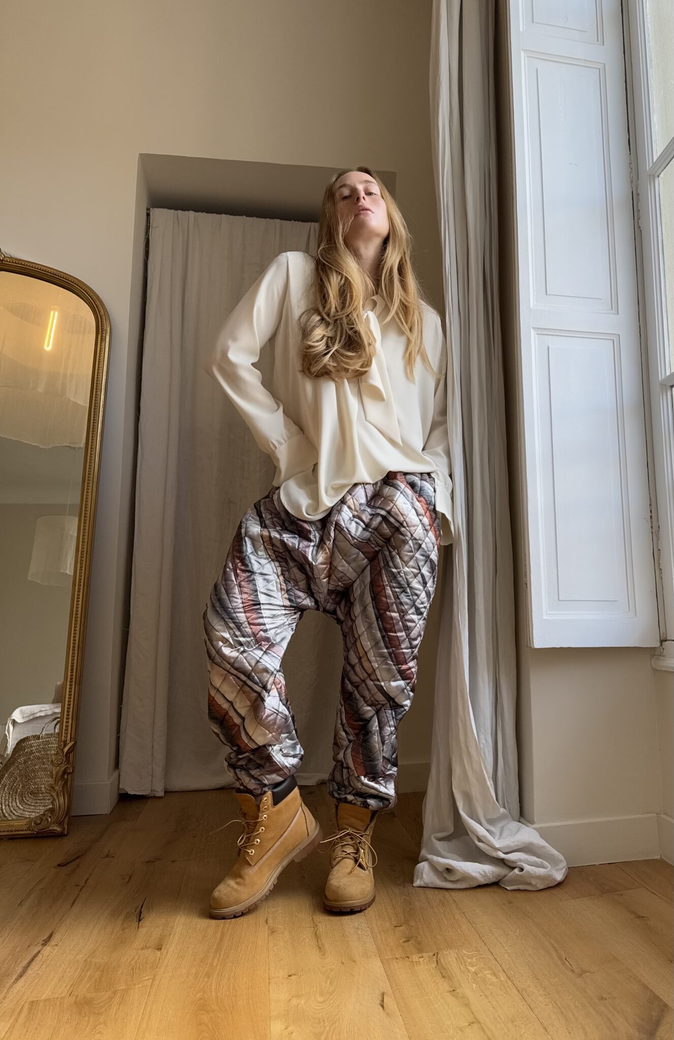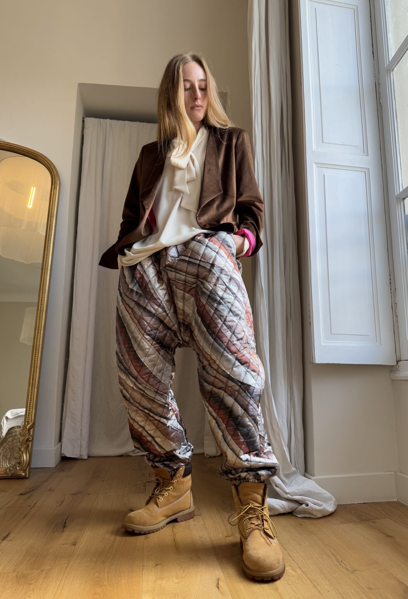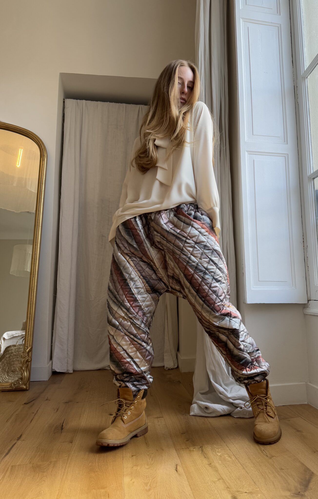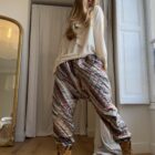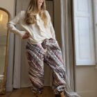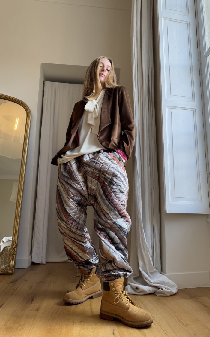 Pantalon « JO » dans un tissu matelassé métallisé à motifs. Taille sur élastique, poches latérales. Une coupe unisexe, loose et oversize, pour un pantalon unique.