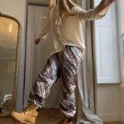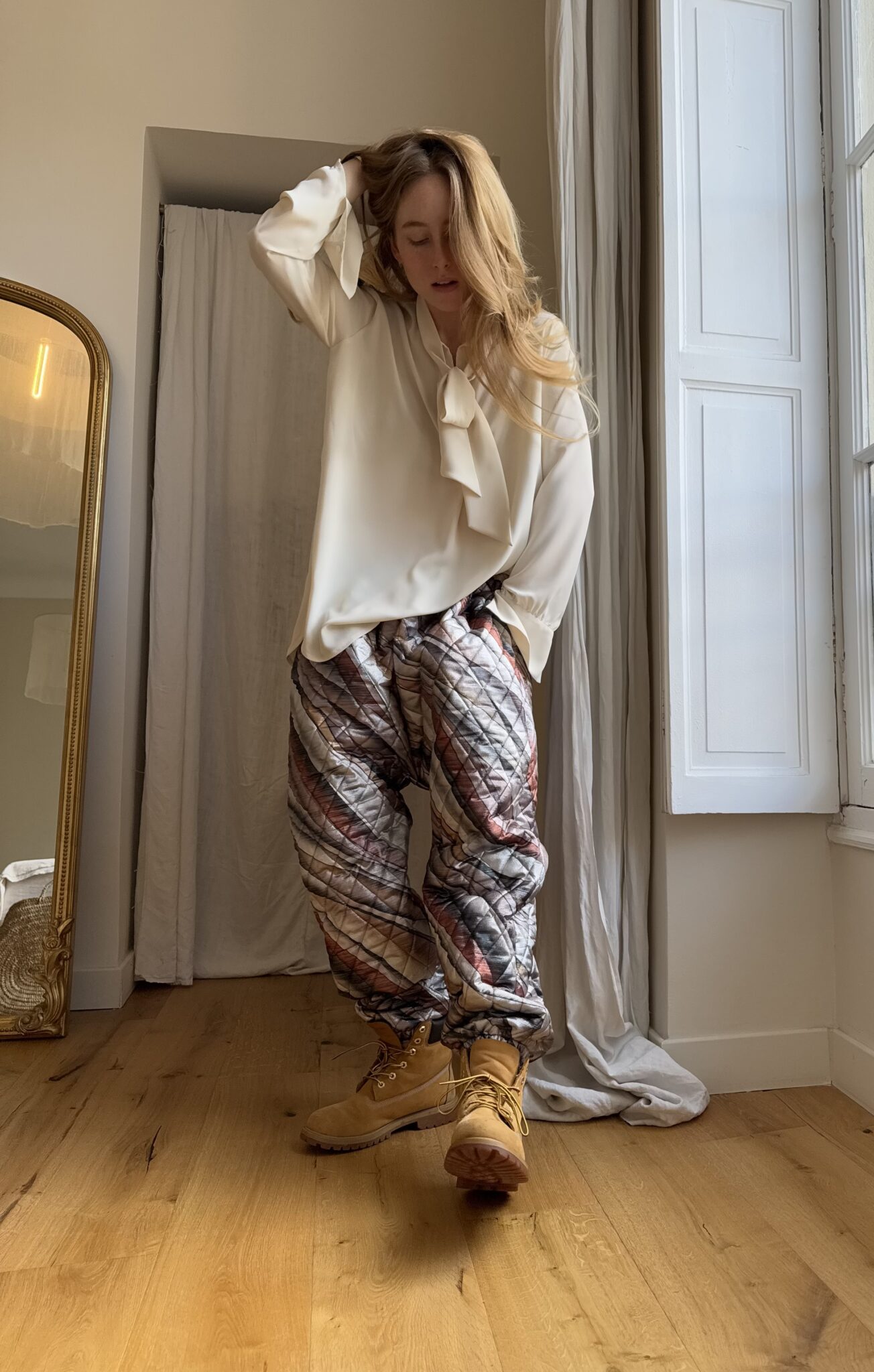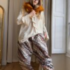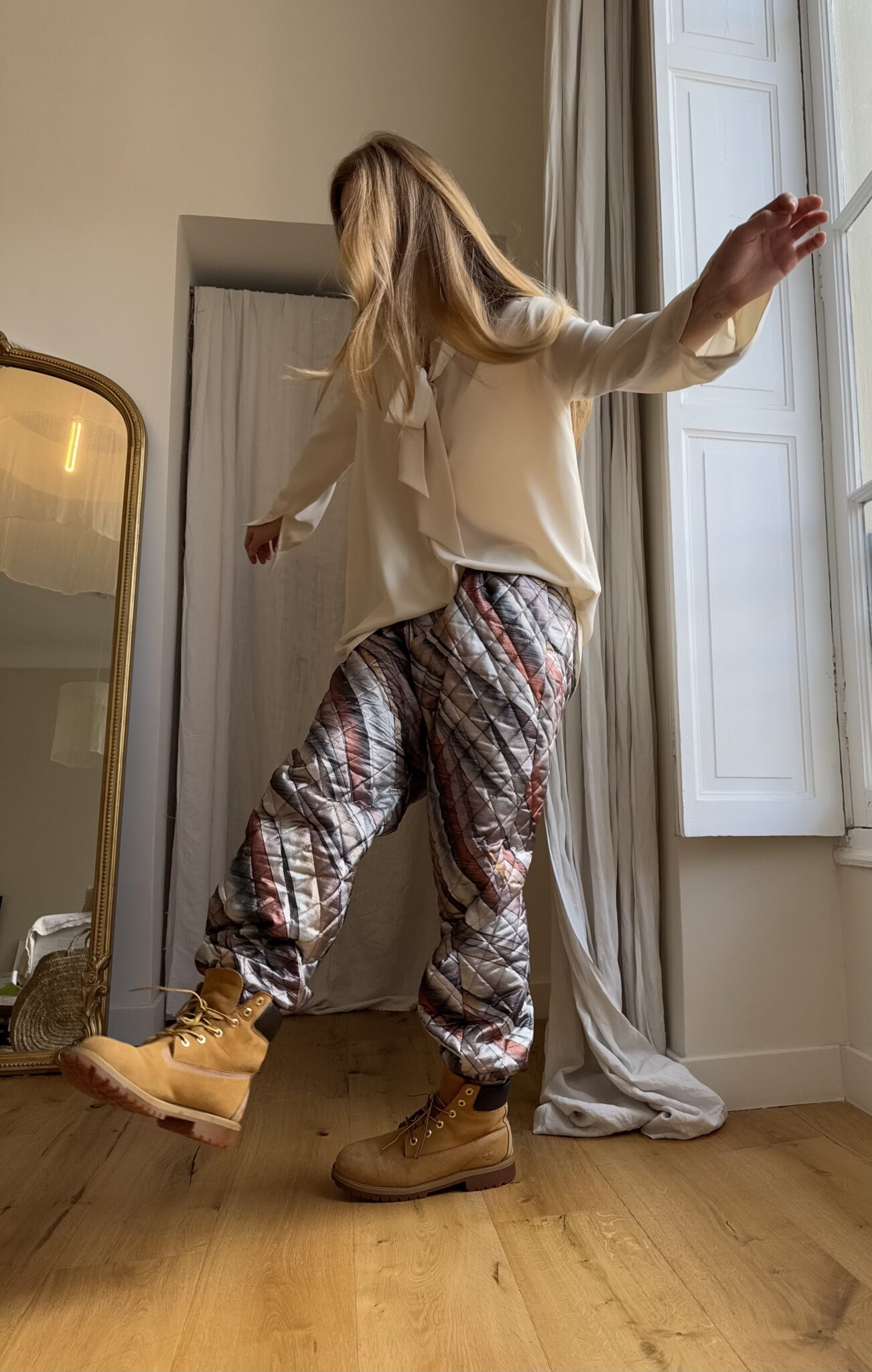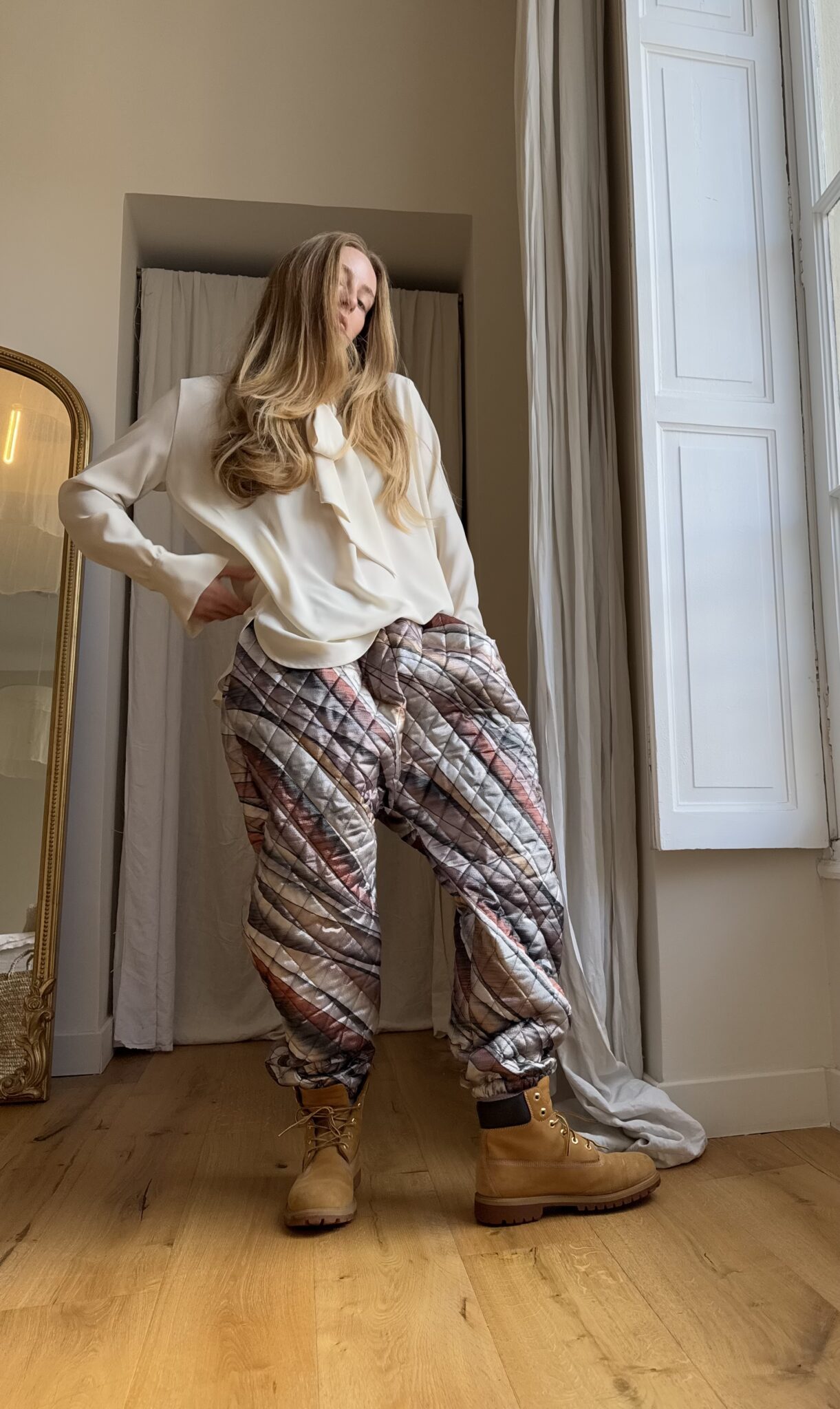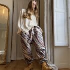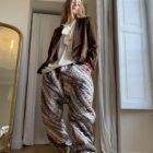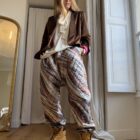 Pantalon « JO » dans un tissu matelassé métallisé à motifs. Taille sur élastique, poches latérales. Une coupe unisexe, loose et oversize, pour un pantalon unique.
