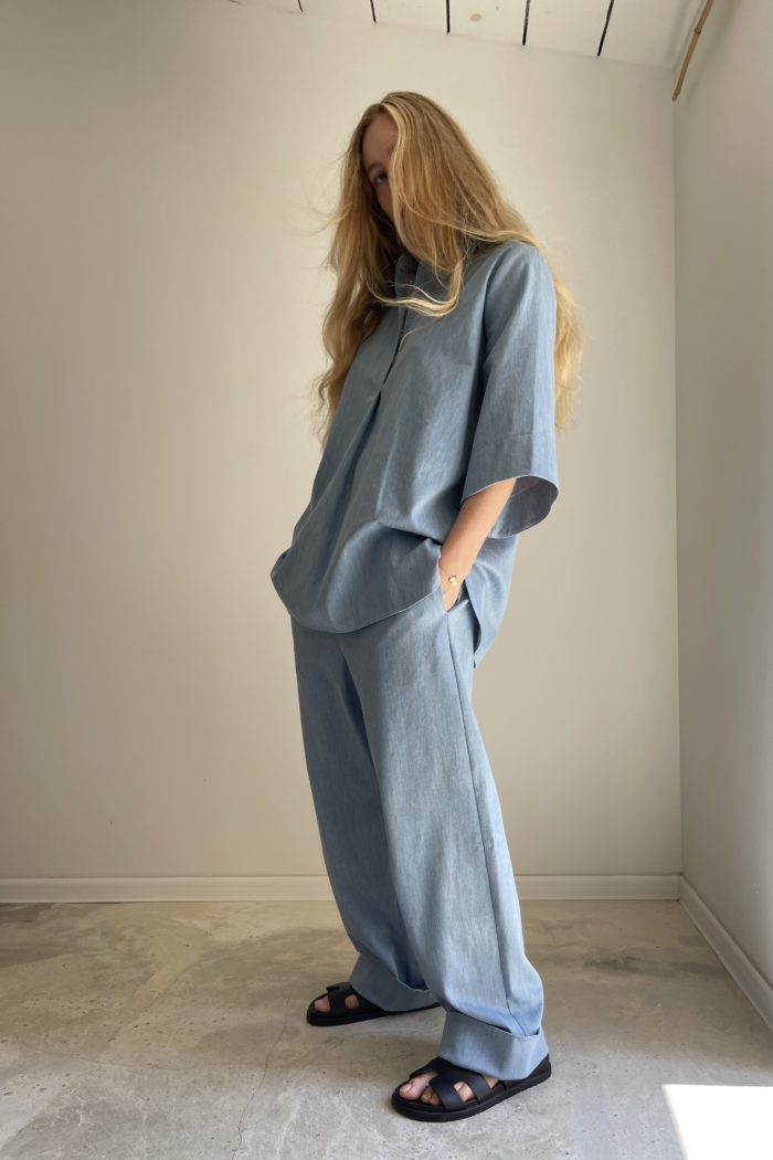 Pantalon « LENNY » en denim léger blanchi, poches latérales, taille elastiquée, coupe droite. Le pantalon intemporel et indispensable à avoir dans son dressing. Élégant & confortable. PIÈCE UNIQUE