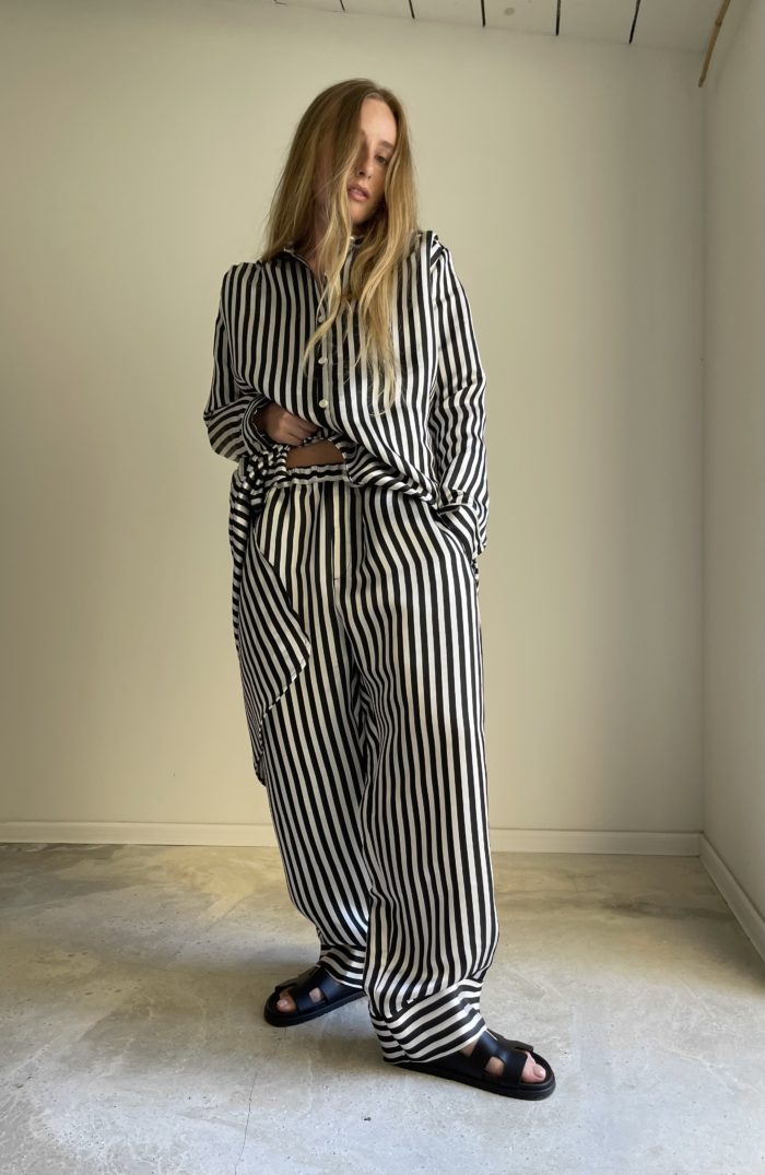 Pantalon « LENNY » 100% soie à rayures, poches latérales, taille elastiquée, coupe droite. Le pantalon intemporel et indispensable à avoir dans son dressing. Élégant & confortable. PIÈCE UNIQUE
