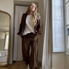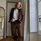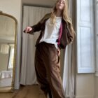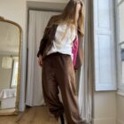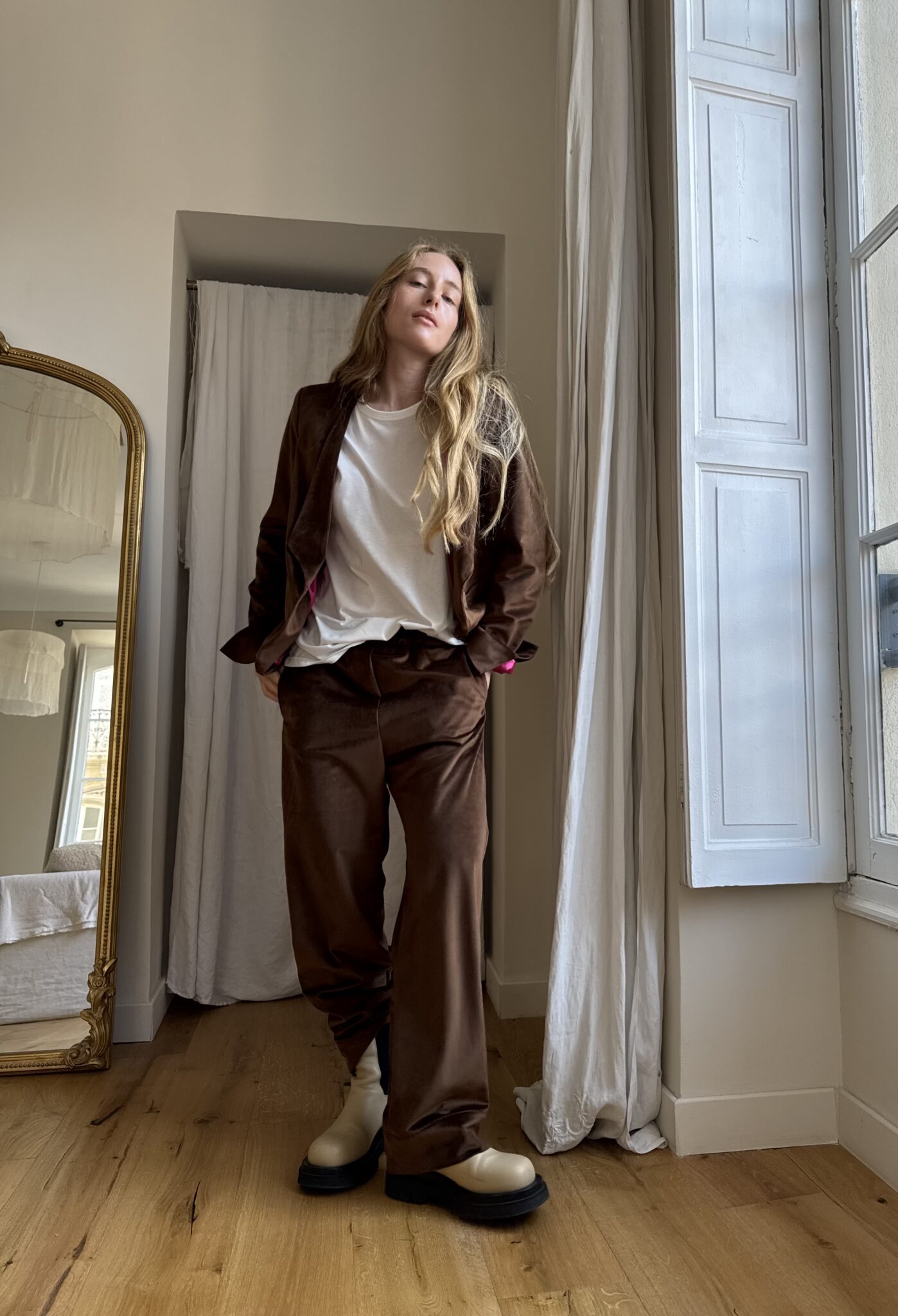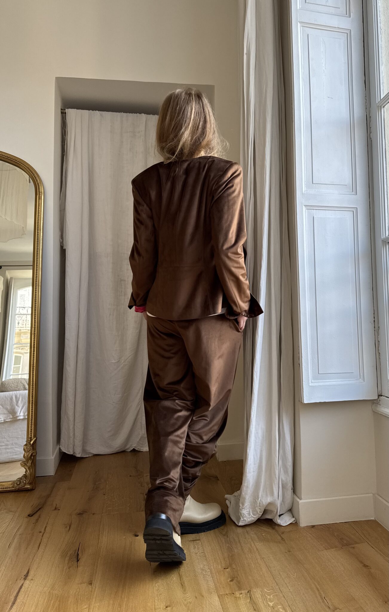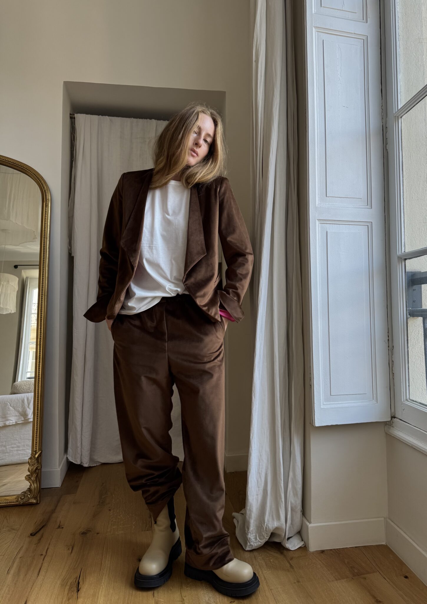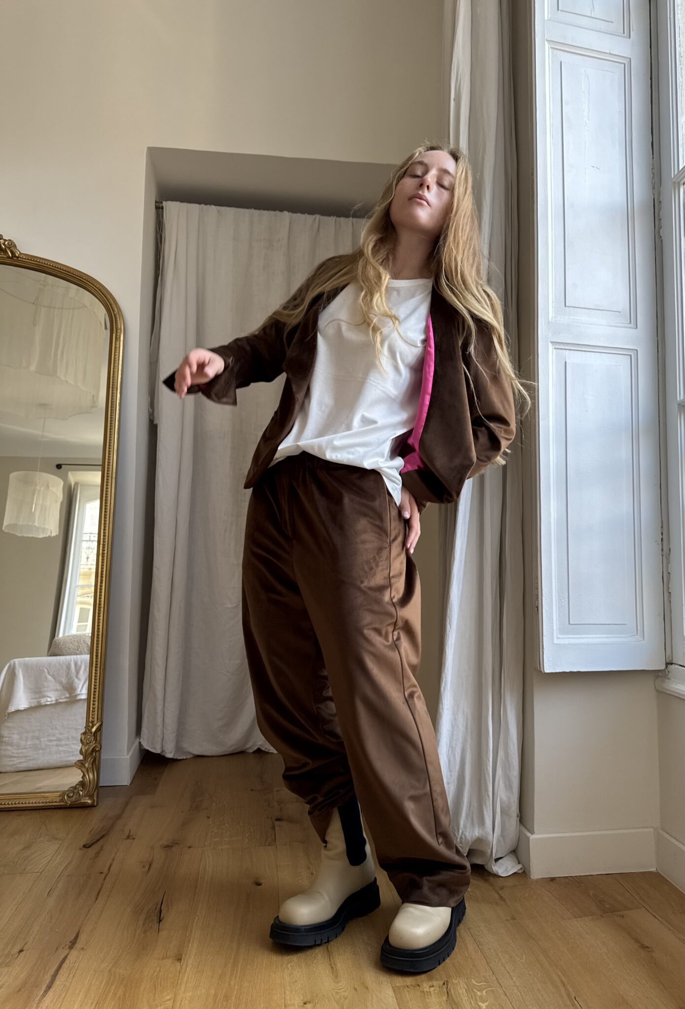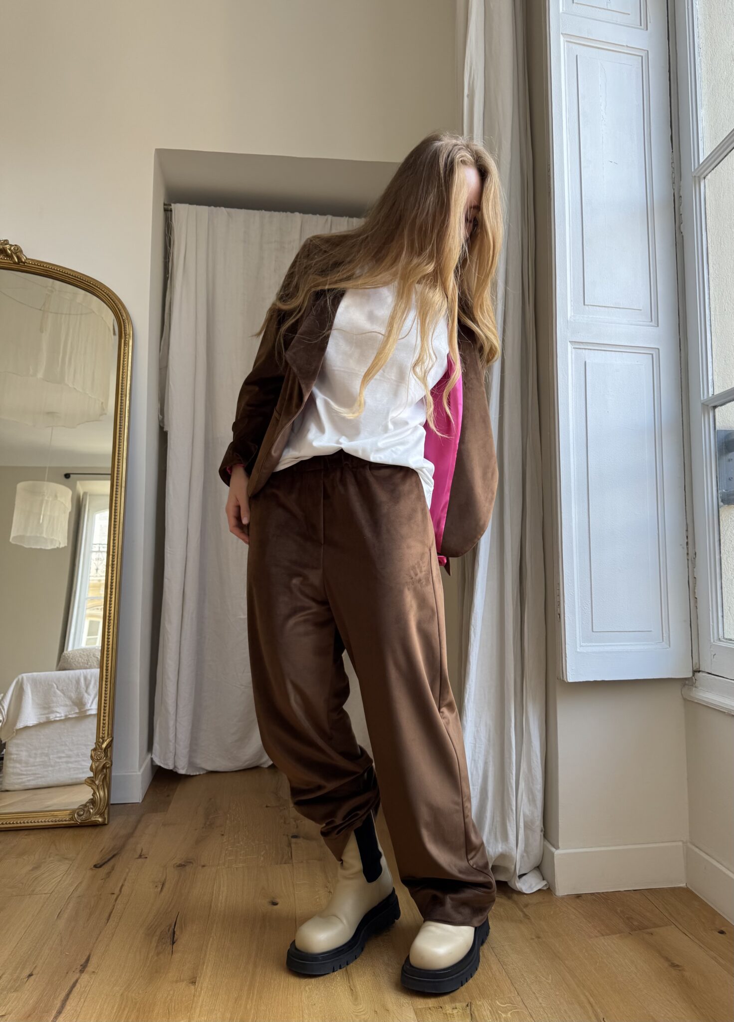 Pantalon « LENNY » en velours lisse chocolat, taille sur élastique, poches latérales. Coupe droite et minimaliste. Ourlet apparent. Un velours d’exception pour un pantalon chic et élégant.