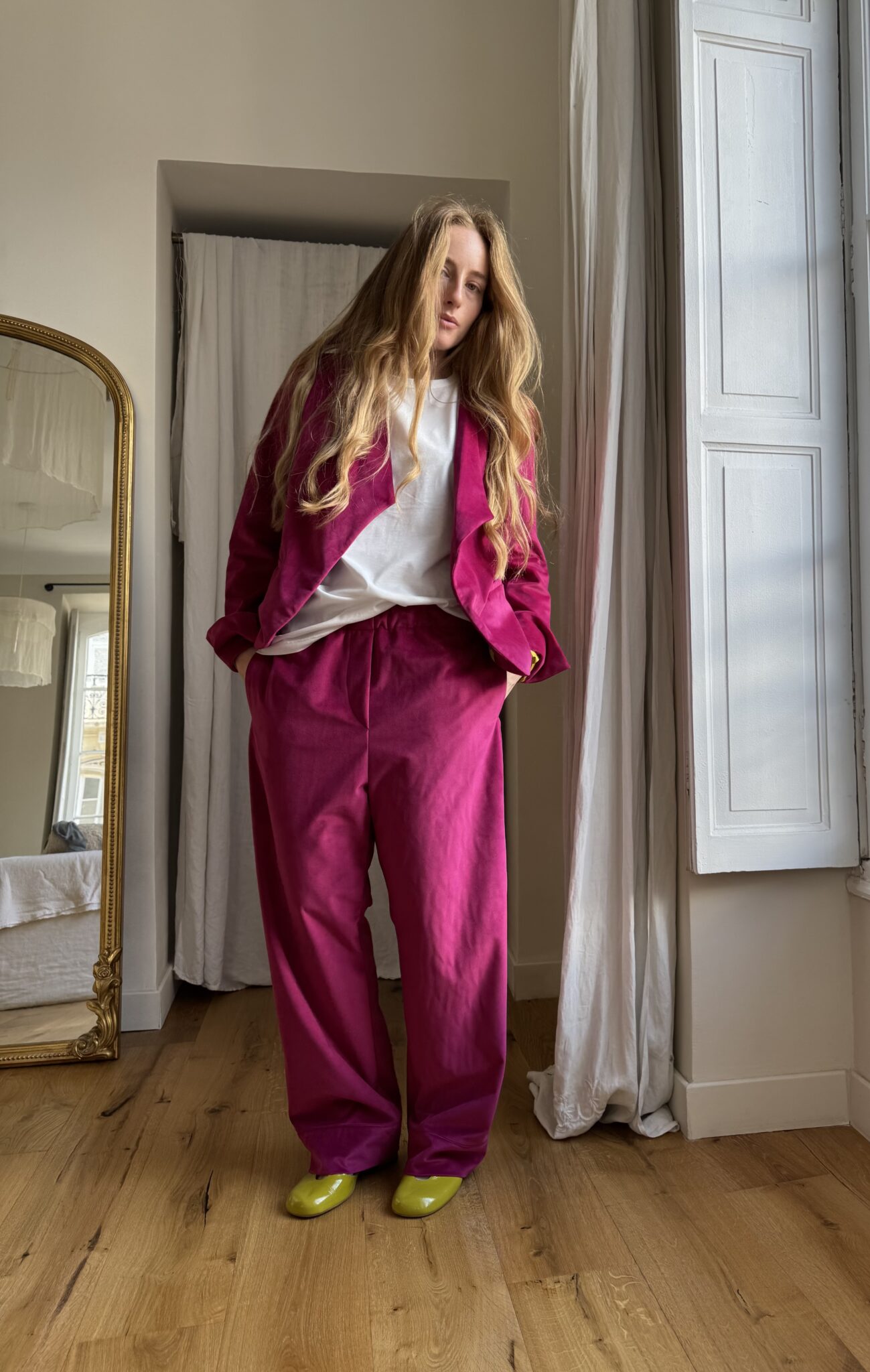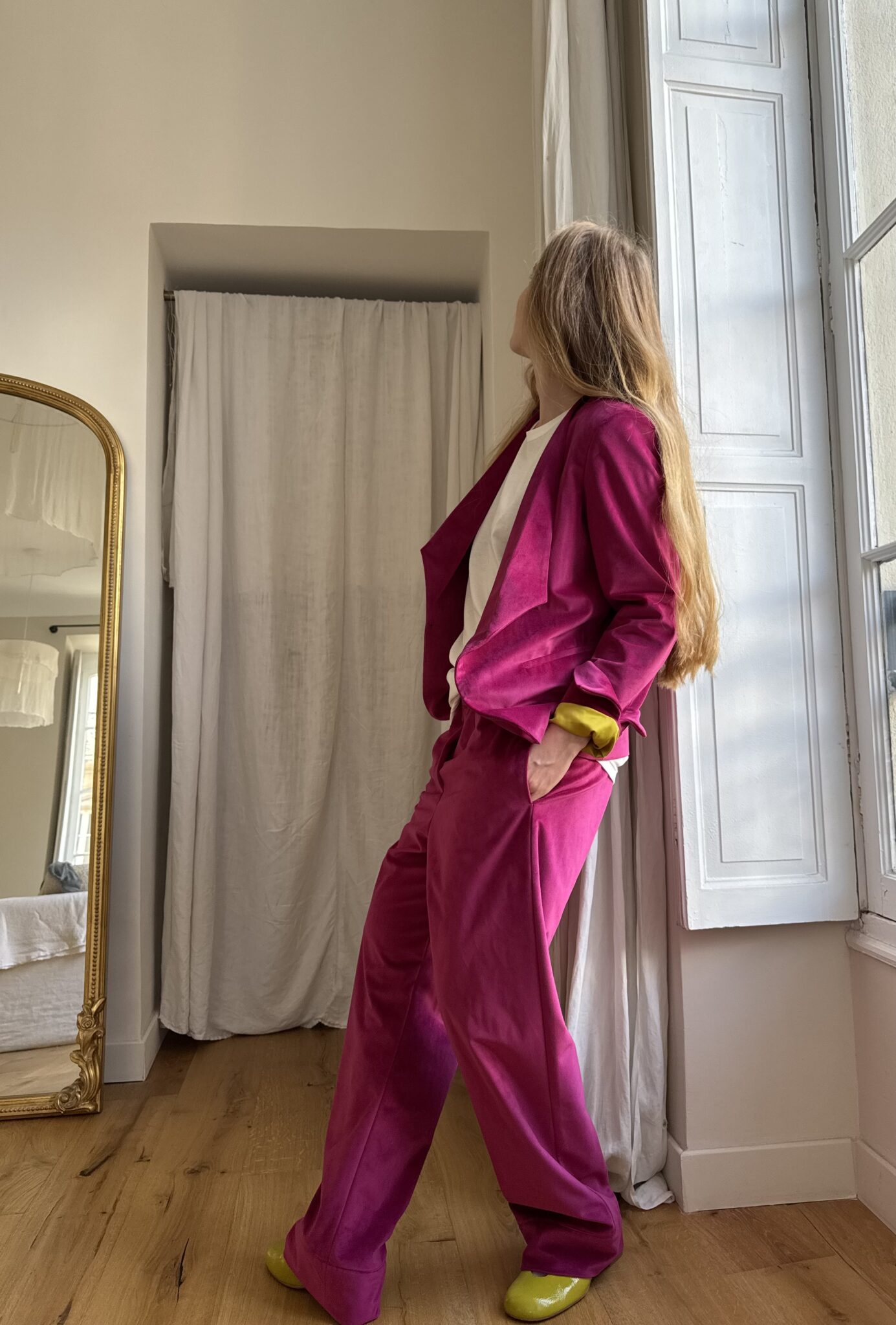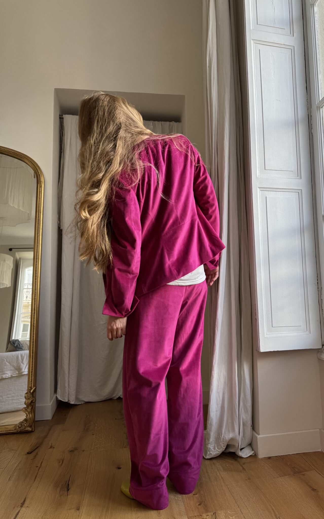 Pantalon « LENNY » en velours lisse framboise, taille sur élastique, poches latérales. Coupe droite et minimaliste. Ourlet apparent. Un velours d’exception pour un pantalon chic et élégant.
