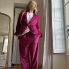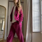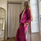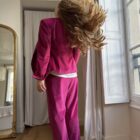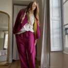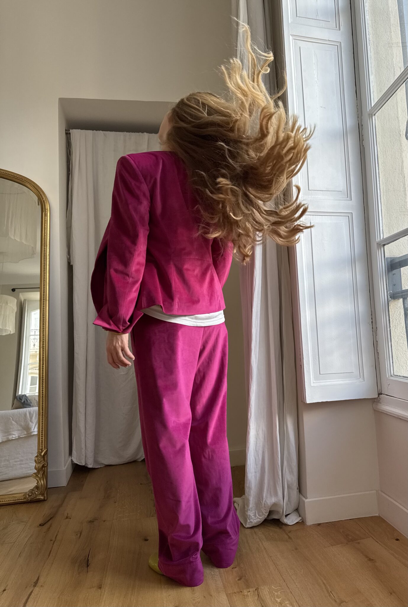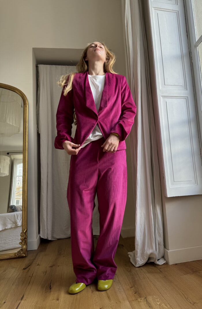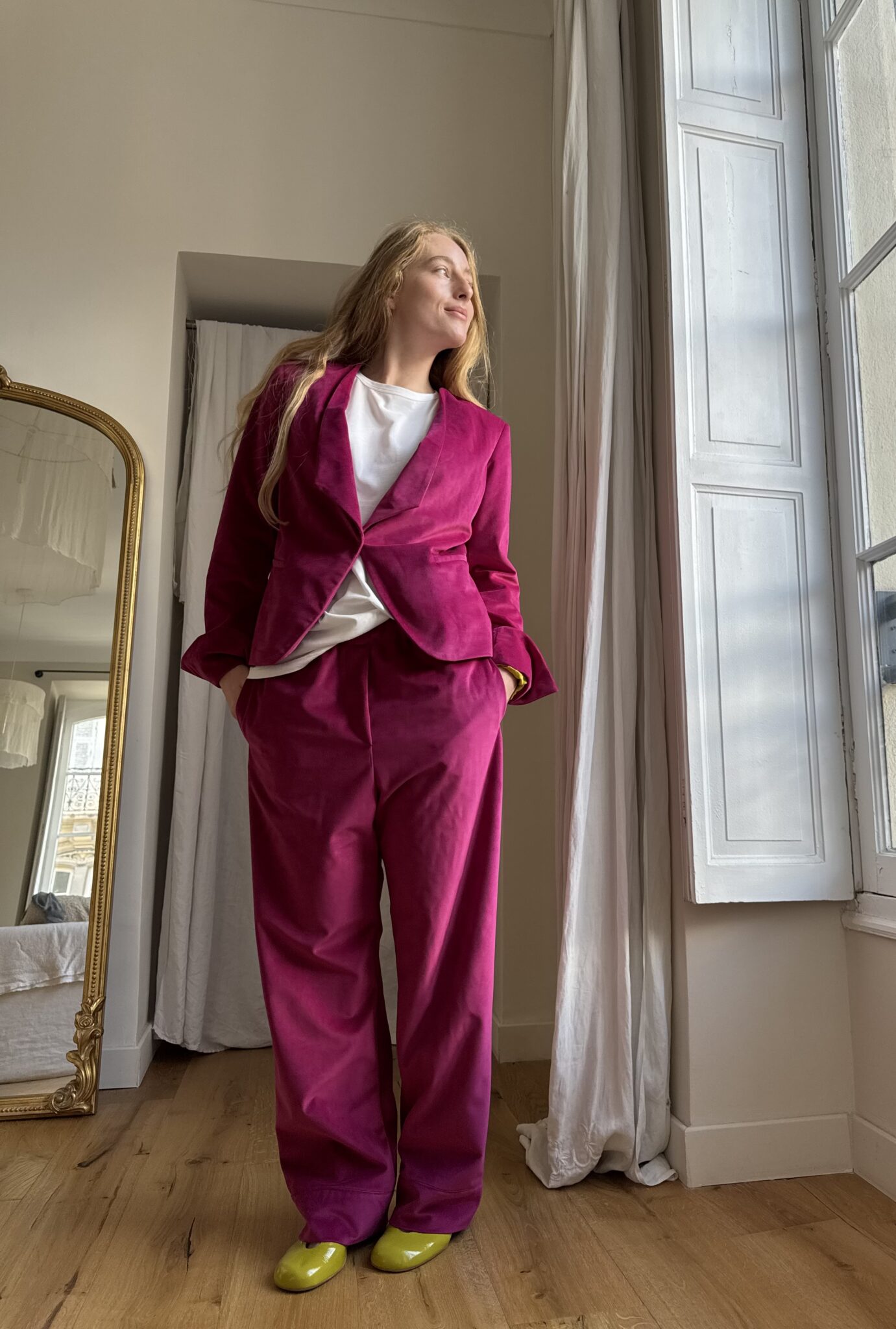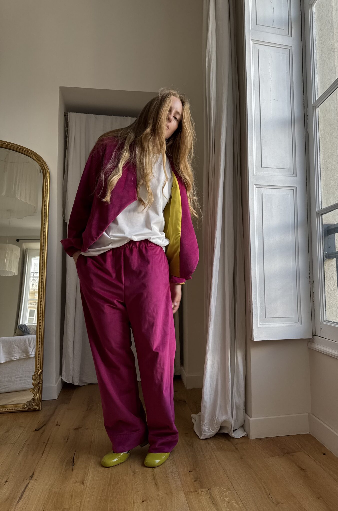 Pantalon « LENNY » en velours lisse framboise, taille sur élastique, poches latérales. Coupe droite et minimaliste. Ourlet apparent. Un velours d’exception pour un pantalon chic et élégant.