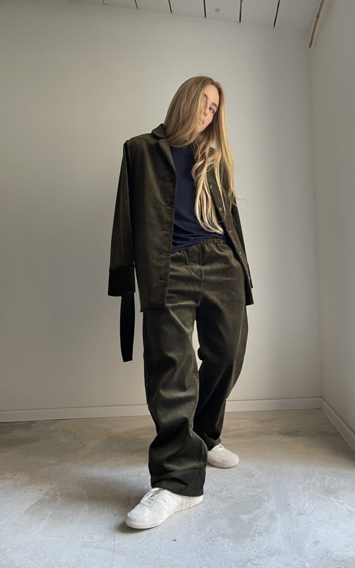 Pantalon « LENNY » en velours côtelé vert olive, taille sur élastique, poches latérales. Coupe droite et minimaliste. Un velours d’exception pour un pantalon chic et élégant.