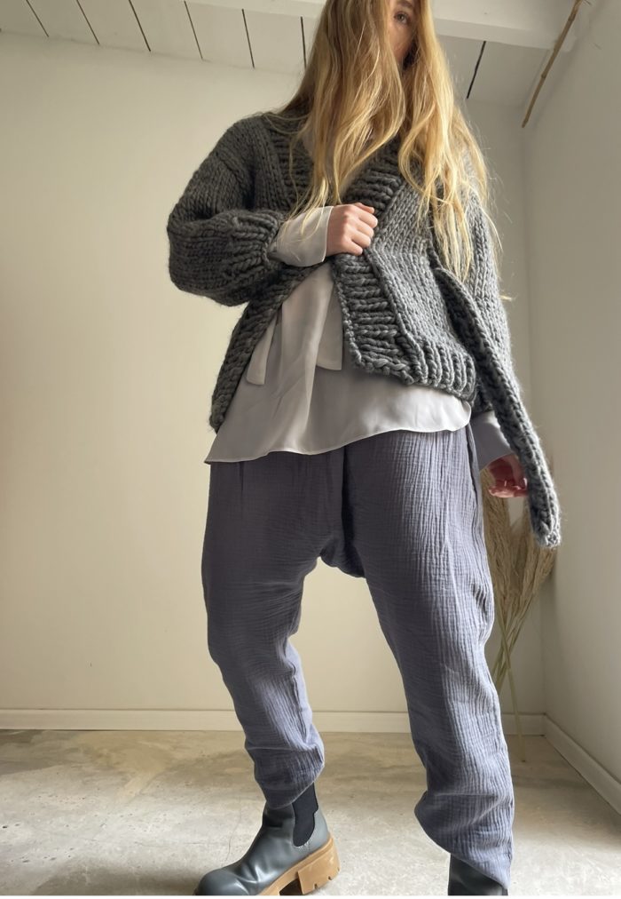 Pantalon « SEAN » en gaze de coton couleur gris orage, taille sur élastique, poches arrières avec fronces. Une coupe loose et stylée. Édition très limitée.
