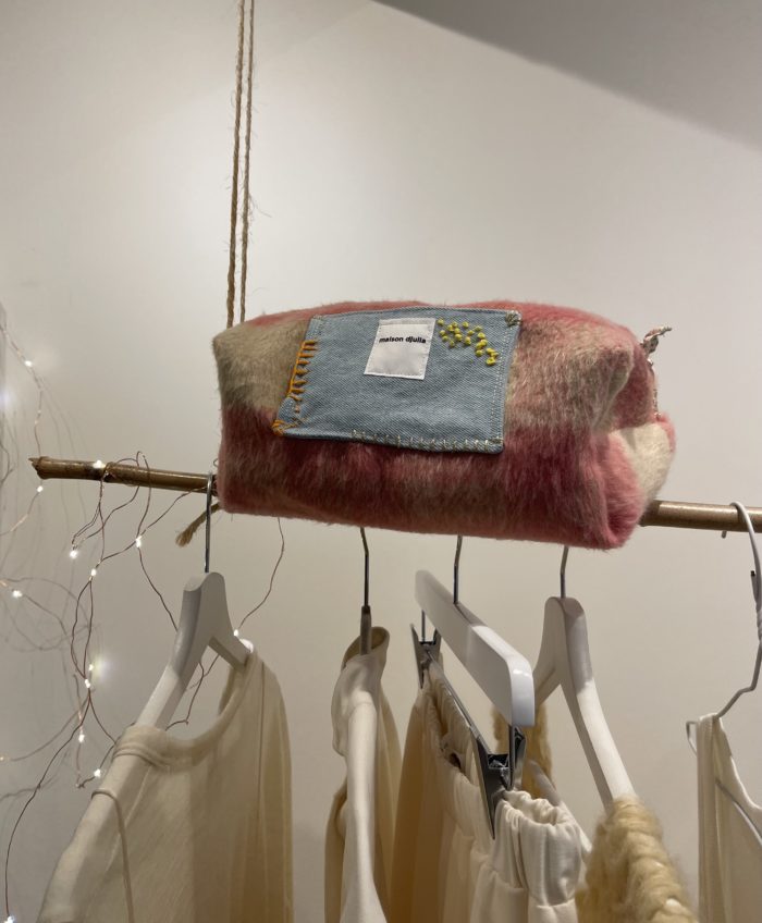 Pochette XL dans un sublime tissu laineux rose, brodée main. Fond de pochette en coton. Une pièce unique et poétique.