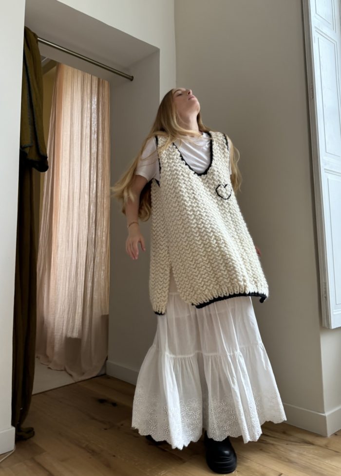 Pull – Débardeur tricoté main en 100% laine. Une création unique, à la coupe loose et intemporelle pour une allure élégante. Création poétique. PIÈCE UNIQUE