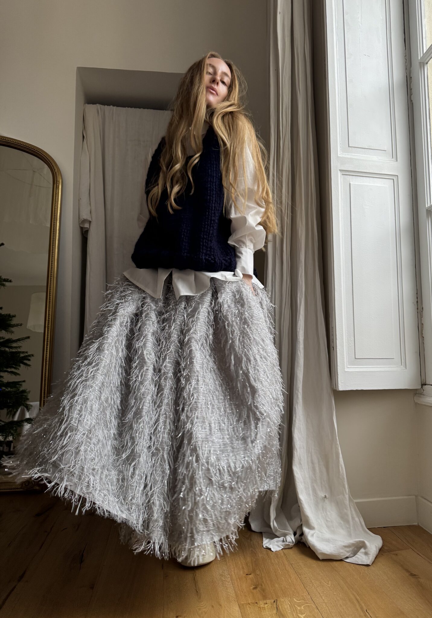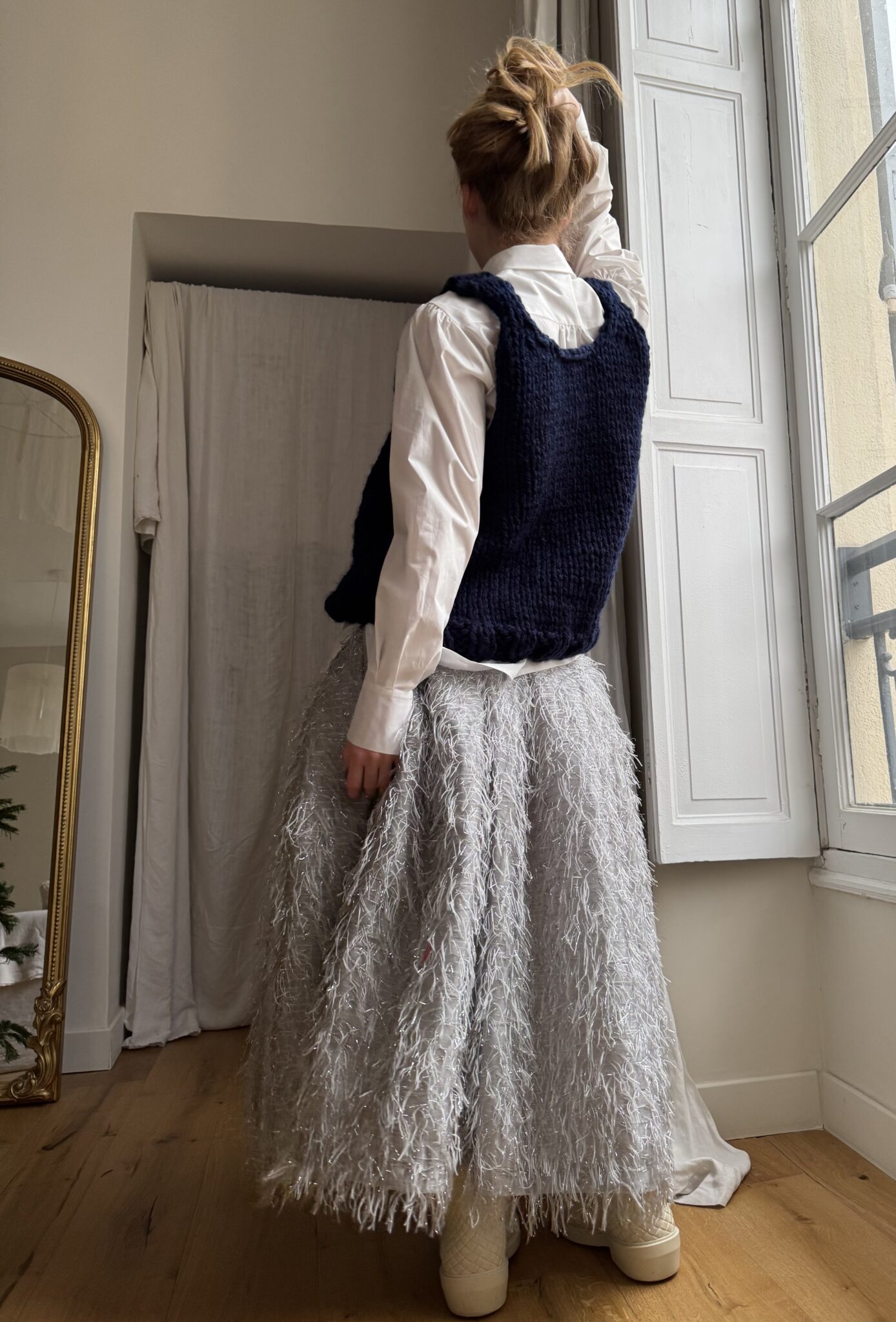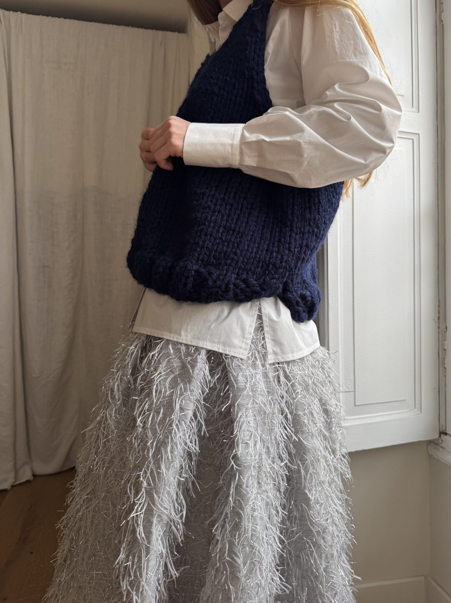 Pull débardeur « MILO » tricoté main en laine bleu nuit. Coupe minimaliste, sans manches. PIÈCE UNIQUE
