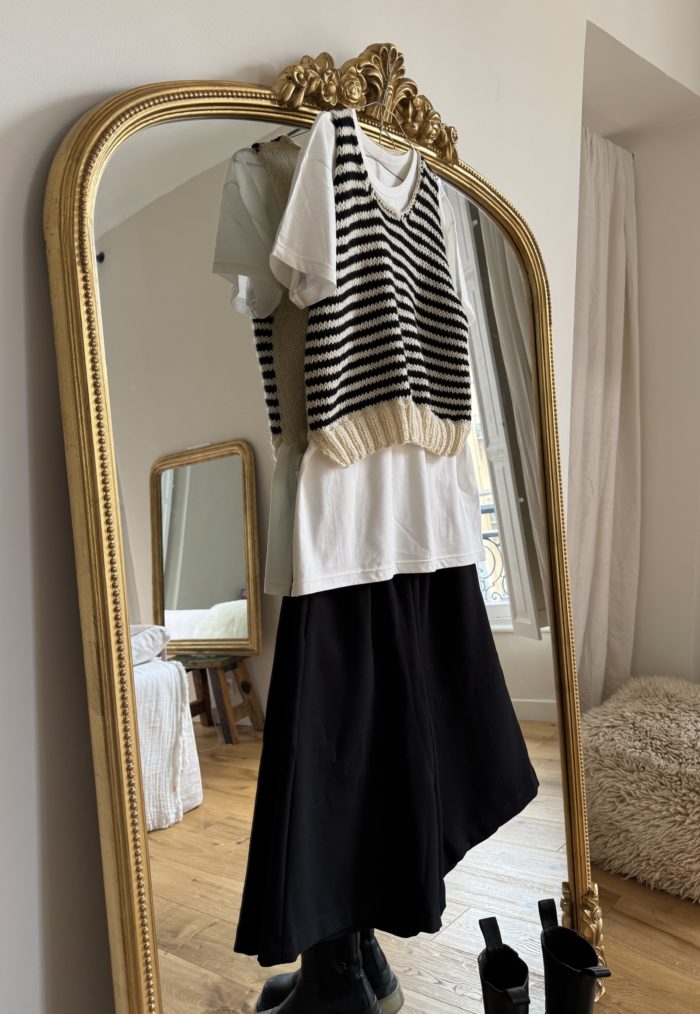 Pull débardeur « MILO » marinière tricoté main en laine écru & noir. Coupe minimaliste, sans manches. PIÈCE UNIQUE