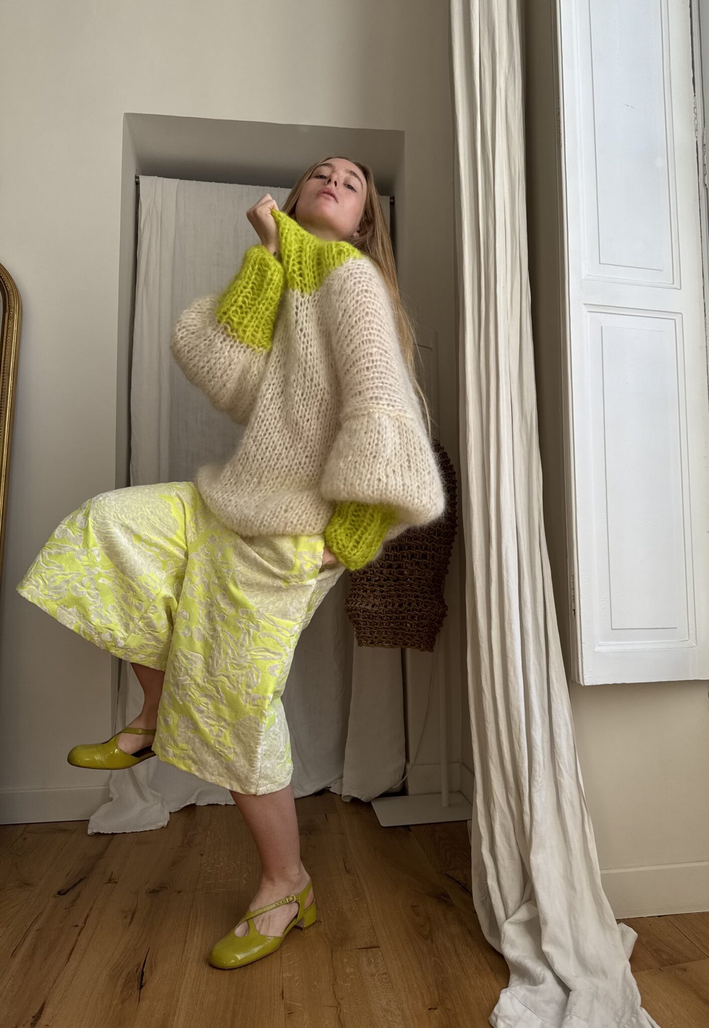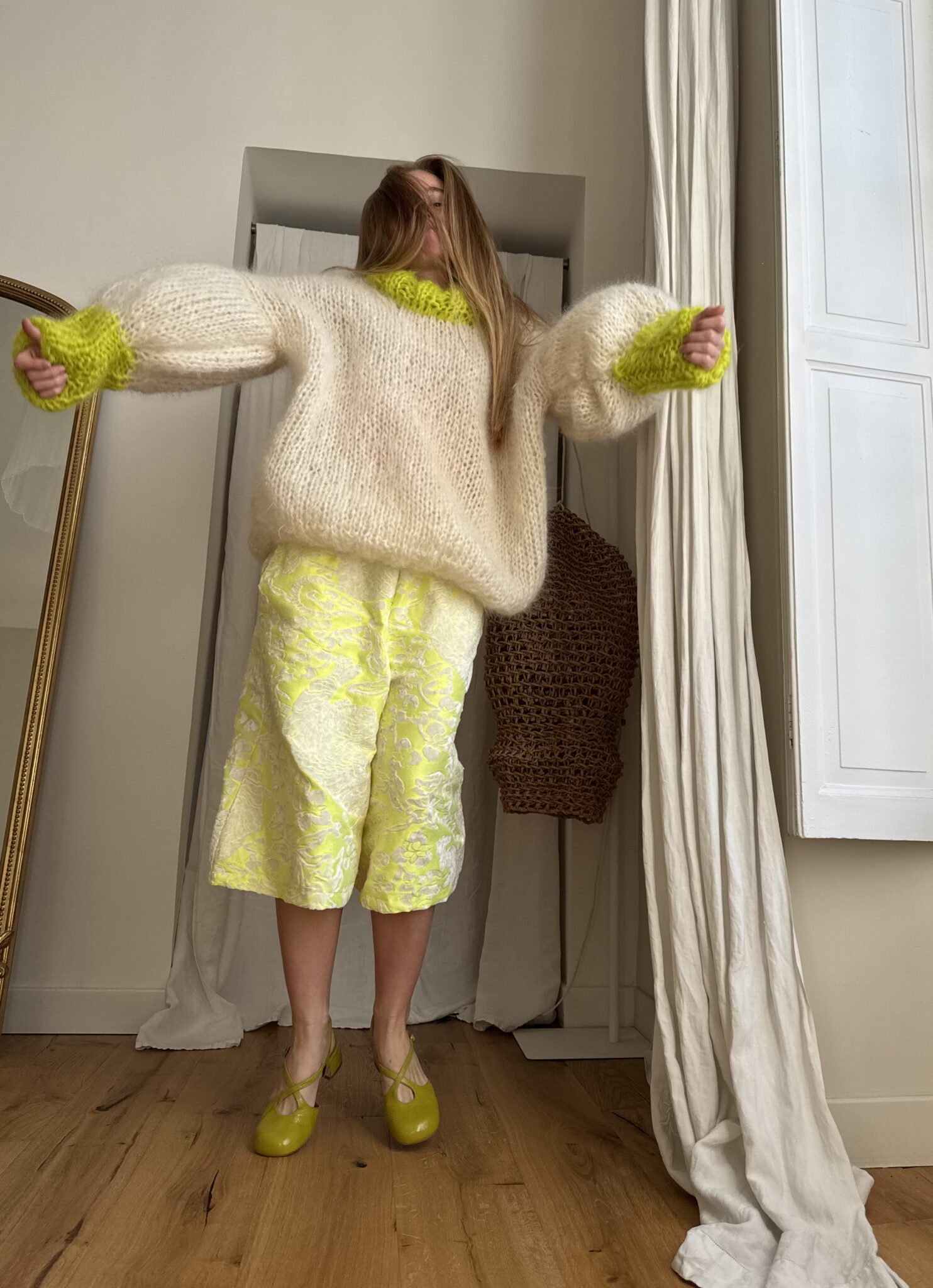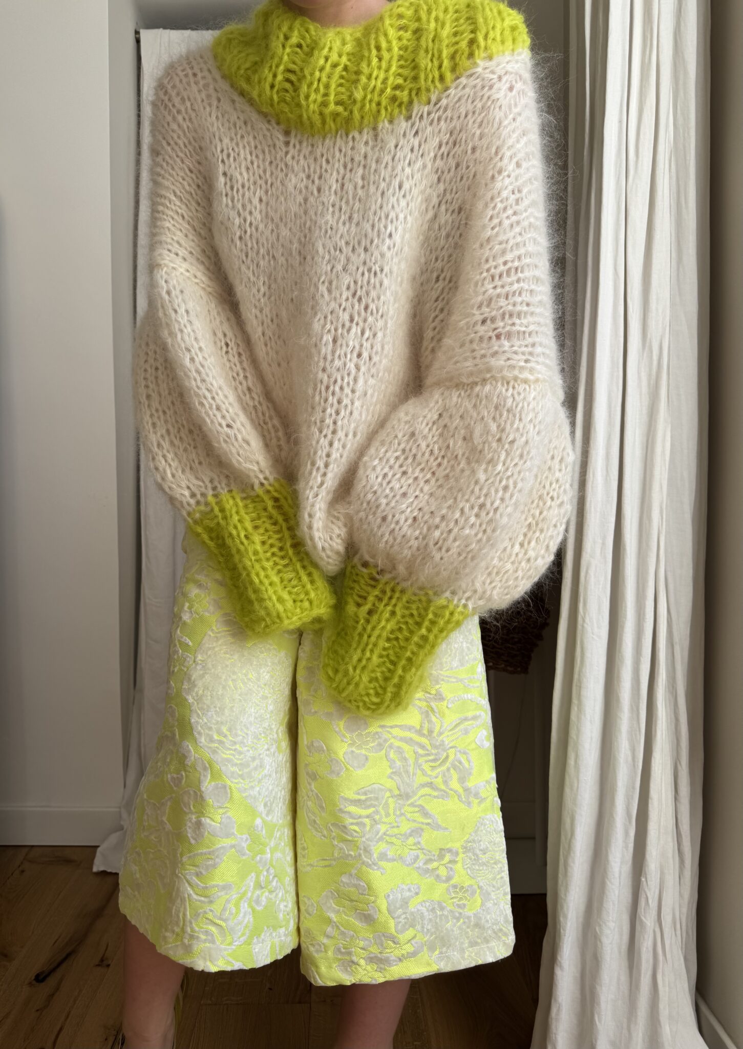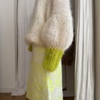 Pull « GASPARD » tricoté main dans un sublime kid mohair écru & vert anis, double fil. Une coupe loose, longues manches ballons resserrées aux poignets, col rond montant. PIÈCE UNIQUE !