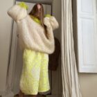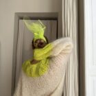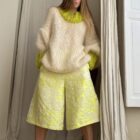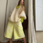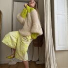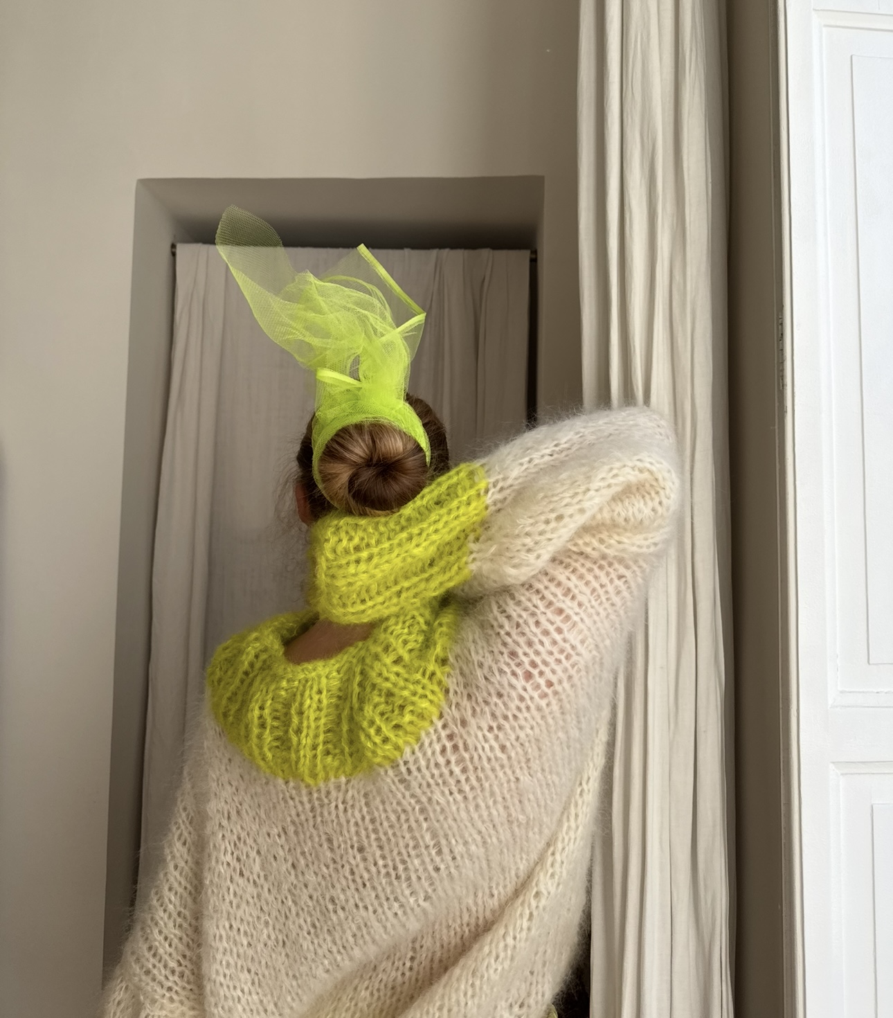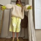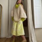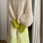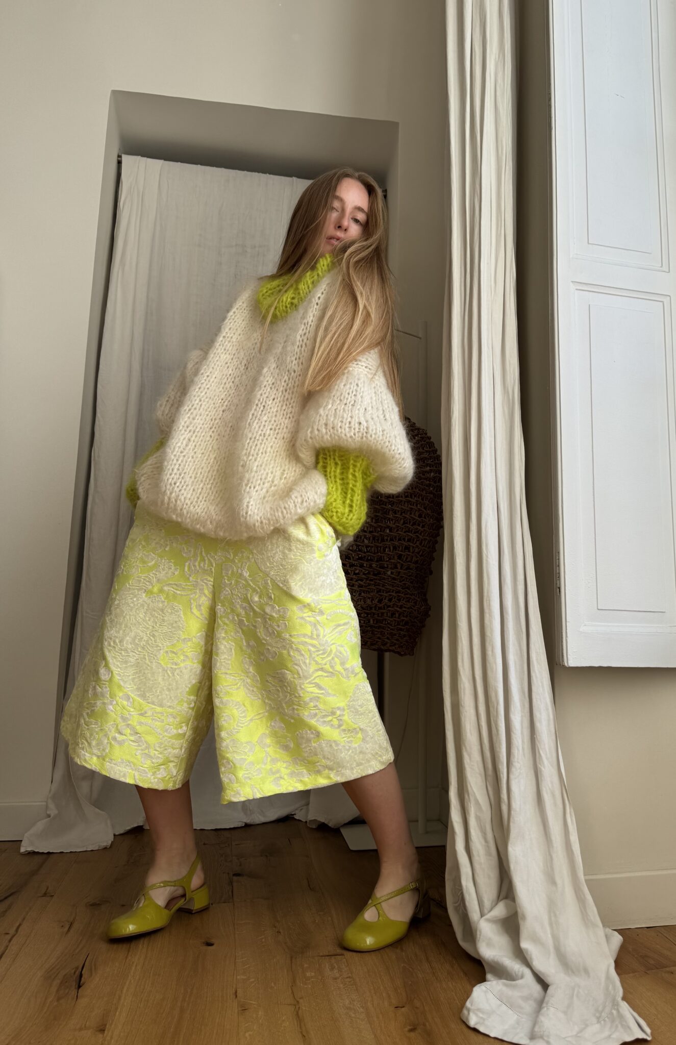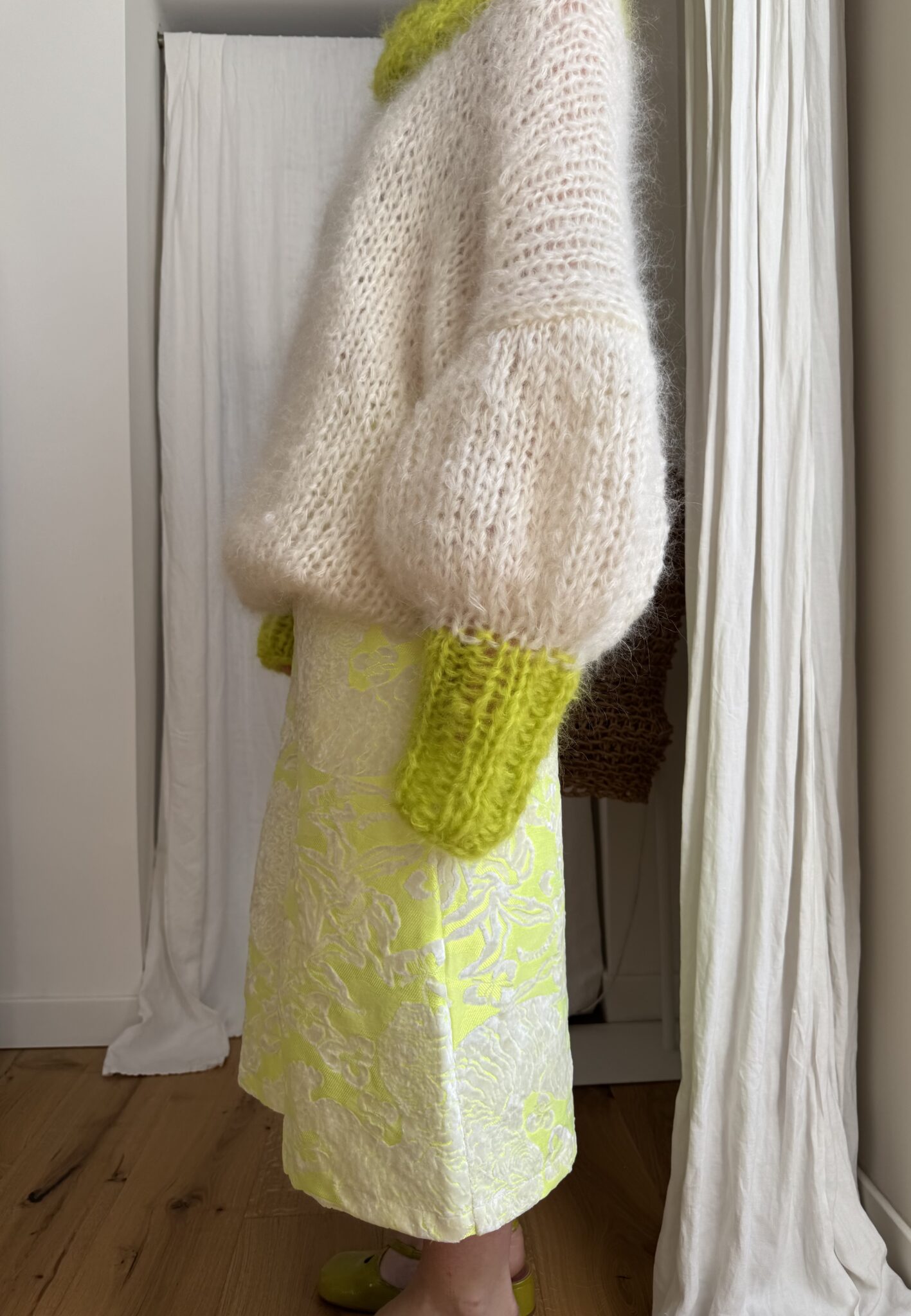 Pull « GASPARD » tricoté main dans un sublime kid mohair écru & vert anis, double fil. Une coupe loose, longues manches ballons resserrées aux poignets, col rond montant. PIÈCE UNIQUE !