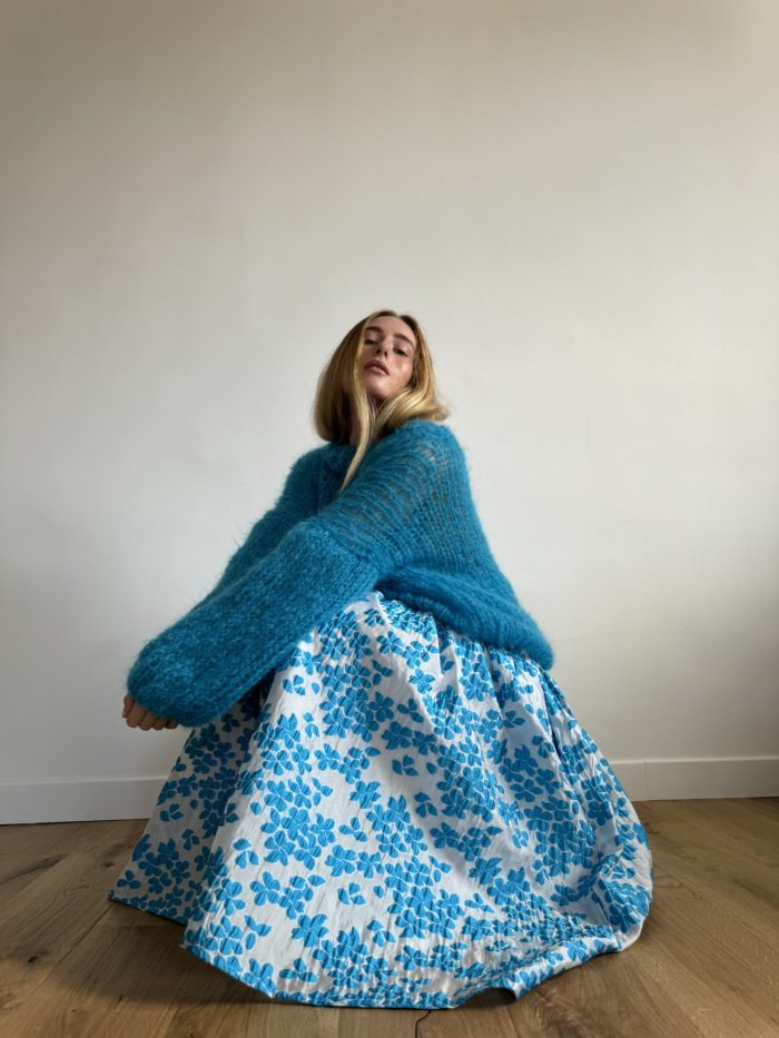 Pull « GASPARD » tricoté main dans un sublime mohair bleu azur. Une coupe loose, longues manches ballons, col légèrement montant. PIÈCE UNIQUE !