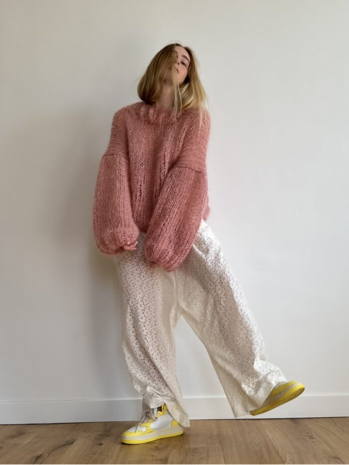 Pull « GASPARD » tricoté main dans un sublime mohair rose. Une coupe loose, longues manches ballons, col légèrement montant. PIÈCE UNIQUE !