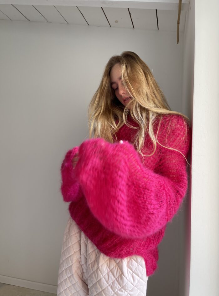 Pull tricoté main 100% mohair fuchsia. Une coupe loose, col montant, longues manches. PIÈCE UNIQUE !
