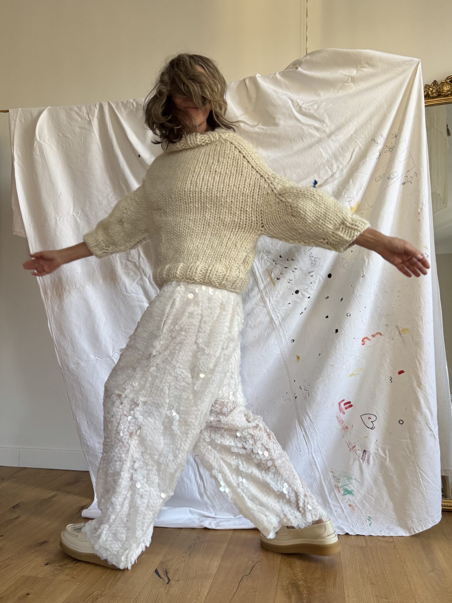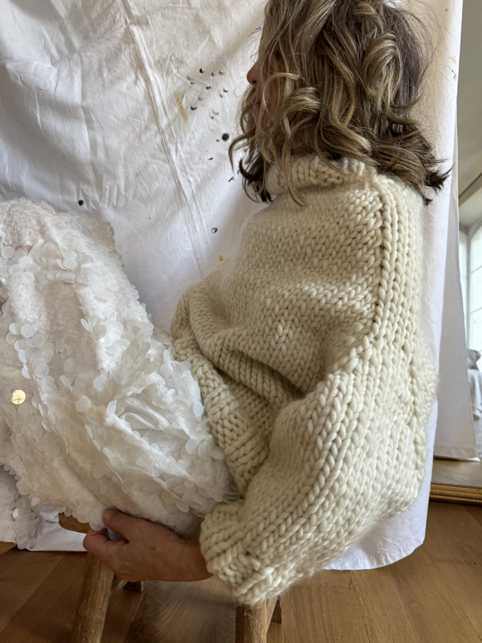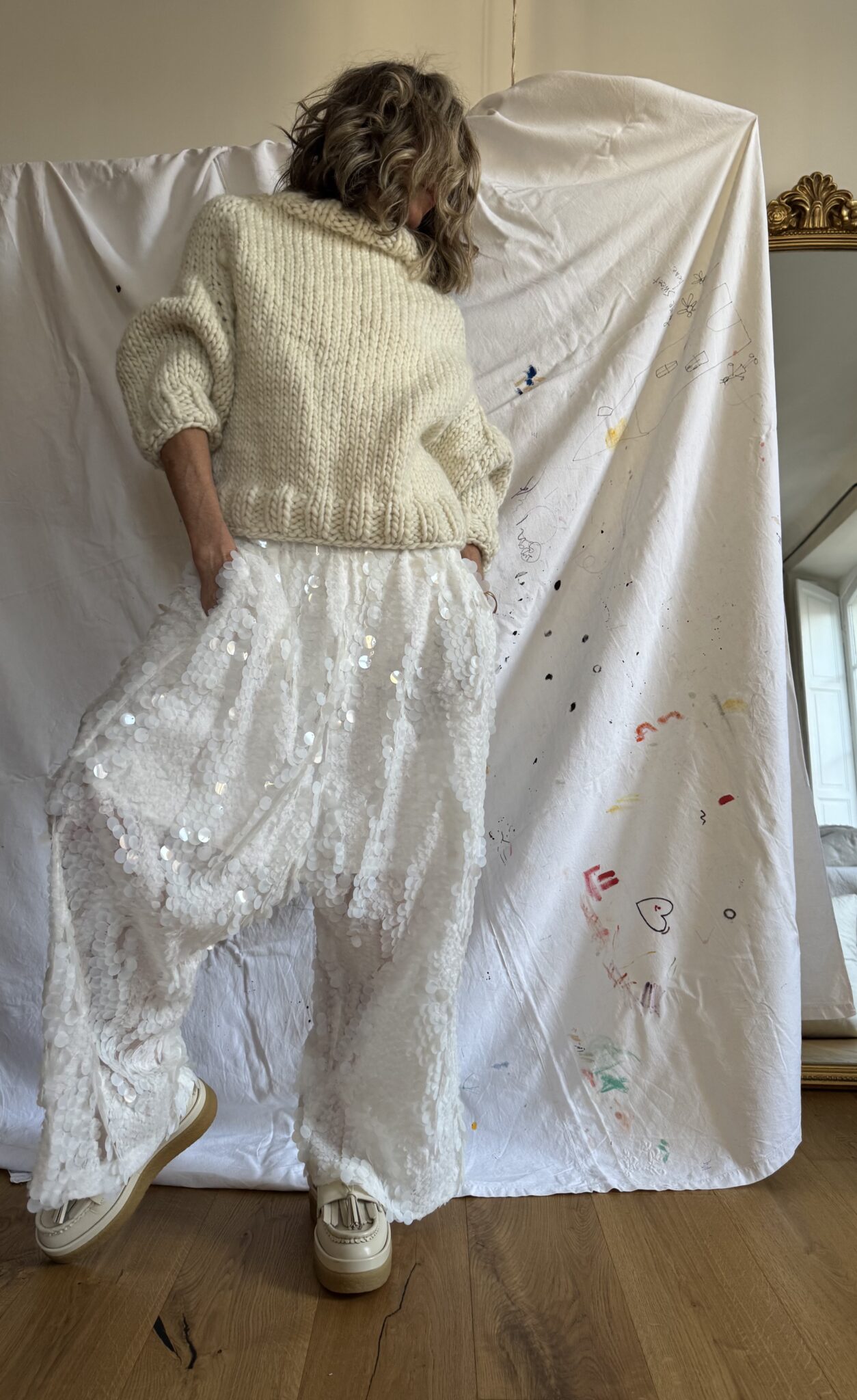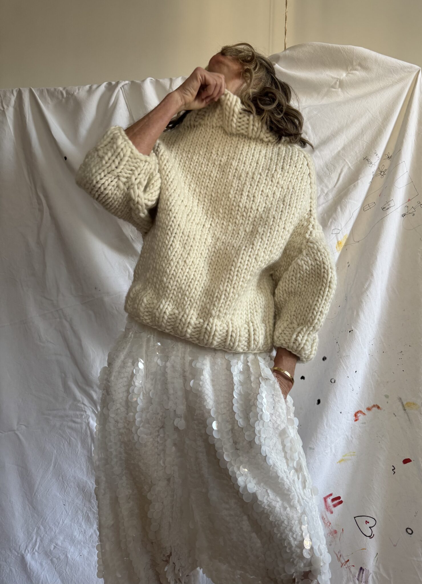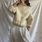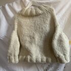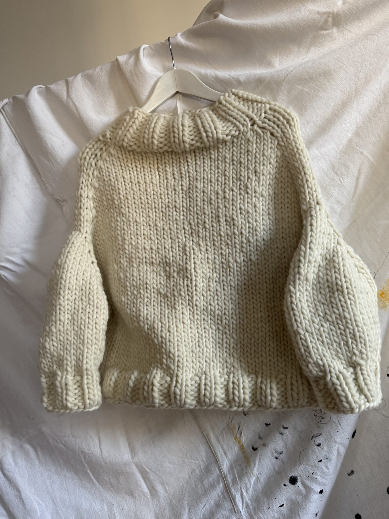 Pull tricoté main en 100% laine. Création unique. Col montant, poignets resserrés. PIÈCE UNIQUE.
