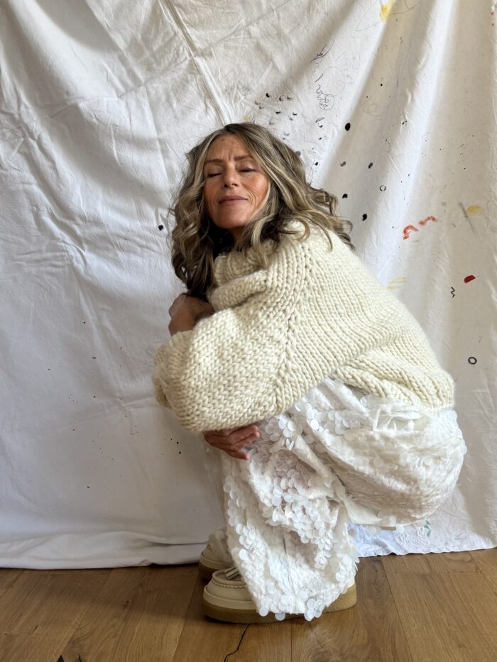 Pull tricoté main en 100% laine. Création unique. Col montant, poignets resserrés. PIÈCE UNIQUE.