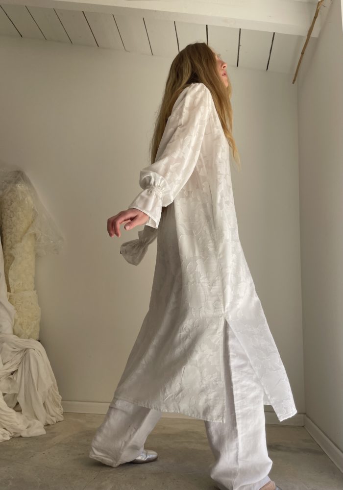 Robe-Chemise « LUCIE » dans un magnifique voile de viscose dévorée fleurie. Robe fluide et légère, poignets à smocks et à volants, fronces au dos, fentes sur les côtés, poches latérales. À porter en robe ou en superposition avec un pantalon et un marcel. Petite édition.