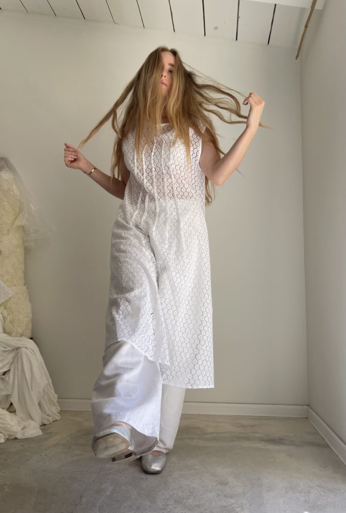 Robe « ÉMY » dans une sublime guipure, une coupe minimaliste et élégante, plis plats. À porter seule avec un fond de robe ou en superposition sur un pantalon. PIÈCE UNIQUE