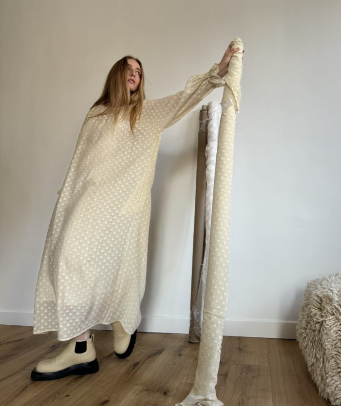 Robe « JEANETTE » dans un sublime coton plumetis léger et aérien. Une robe longue, fluide, un col froncé, des poignets à volants et froncés. Poches. Une robe élégante et romantique.