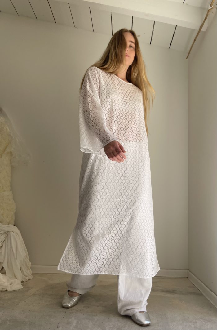 Robe « LEONIE » dans une sublime guipure. Une coupe minimaliste et élégante, manches longues légèrement évasées, bas de robe fendue sur les côtés. À porter seule avec un fond de robe ou en superposition sur un pantalon. PIÈCE UNIQUE