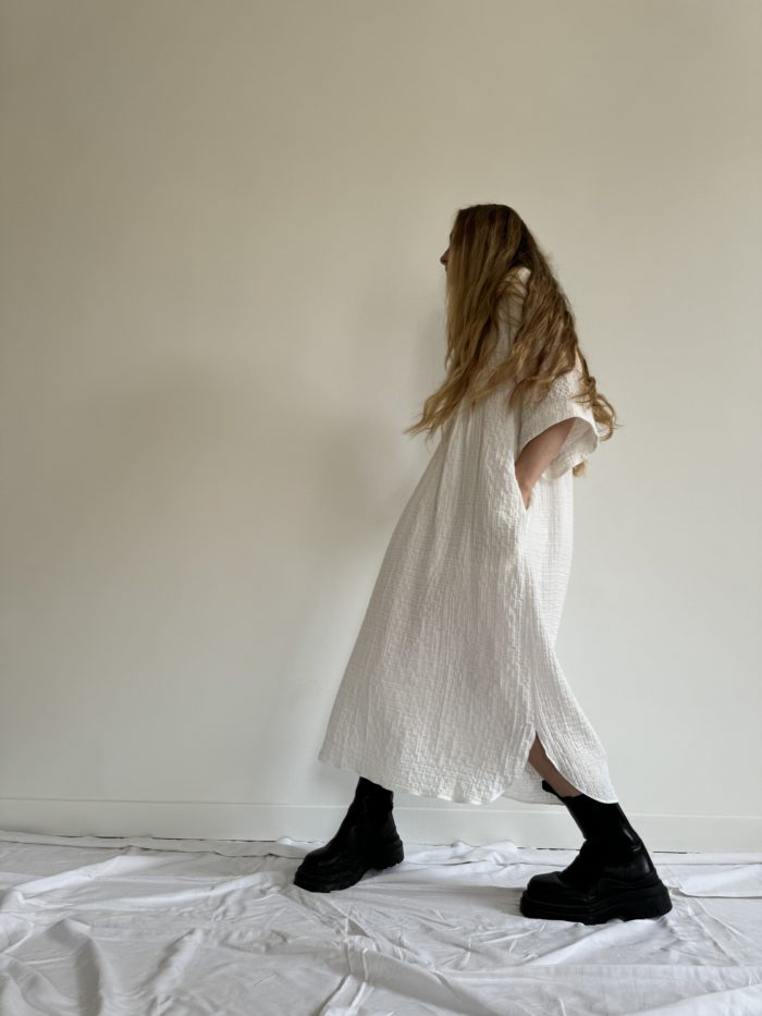 Robe « LILY » dans une sublime double gaze de coton écru. Manches 3/4, poches, fentes et arrondi en bas de robe, boutons et plis plats. Une coupe minimaliste pour une robe élégante et romantique. PIÈCE UNIQUE