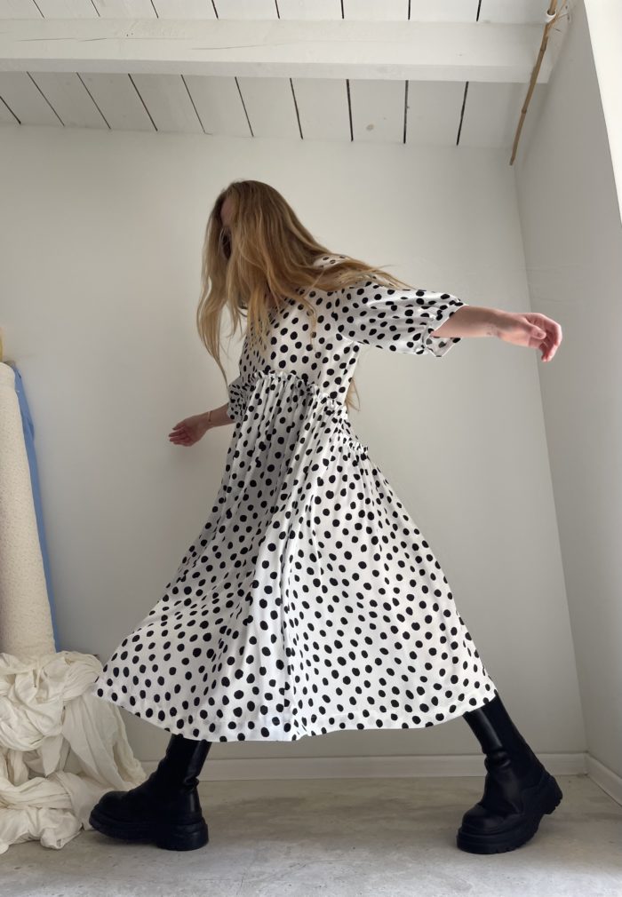 Robe « LOUISE » dans une magnifique viscose satinée à pois noirs sur fond blanc. Robe fluide, légère, fronces à la taille, manches 3/4, poches. Petite édition.