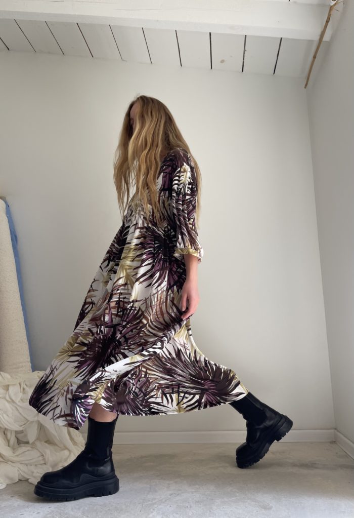 Robe « LOUISE » dans une magnifique viscose satinée à motifs palmiers. Robe fluide, légère, fronces à la taille, manches 3/4, poches. Petite édition.