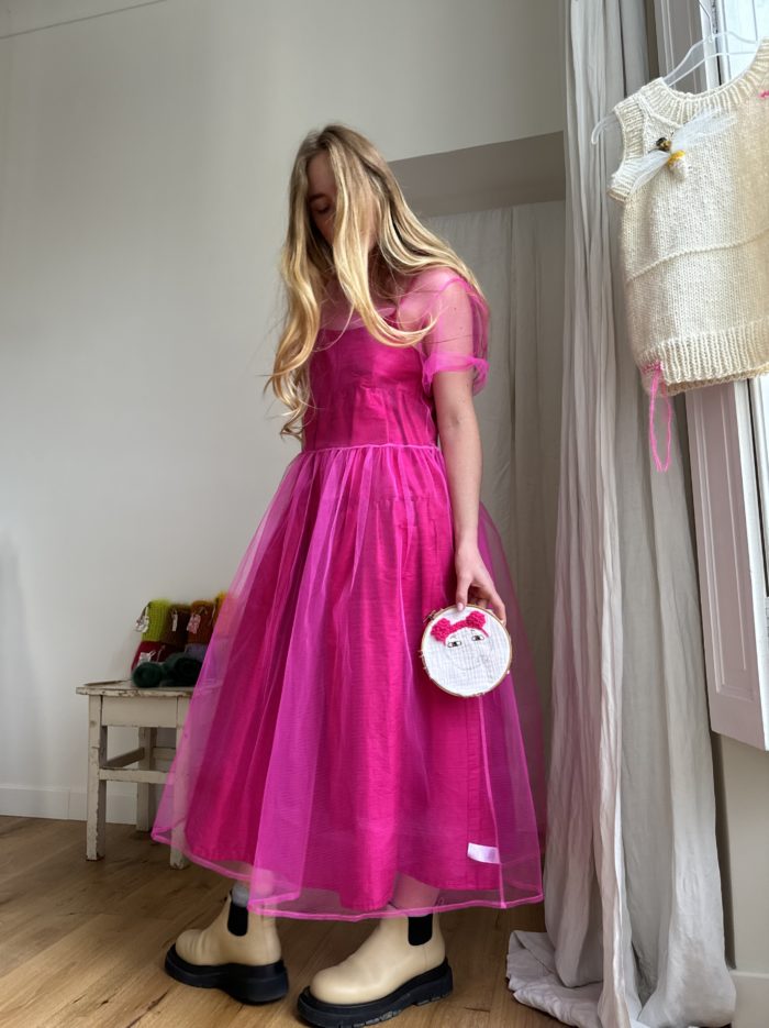 Robe « LOUISETTE » en tulle fuchsia, coupe minimaliste et intemporelle pour une robe originale.