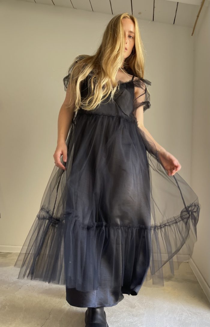 Robe « LOUISETTE » en tulle noir. Des fronces et des volants pour une pièce unique et originale. A superposer selon vos idées ! Raffinée et élégante. PIÈCE UNIQUE
