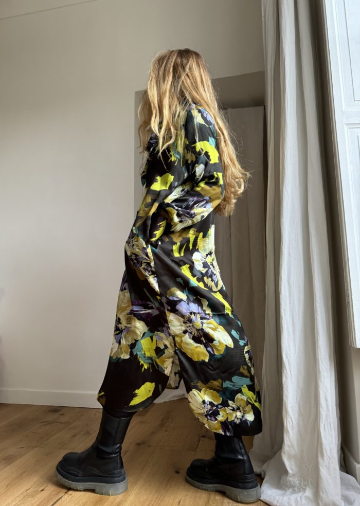 Robe « LUCIE » dans une magnifique soie fleurie. Col lavallière, poches latérales, boutons aux poignets, fentes latérales en bas de robe. Robe fluide, élégante et poétique. PIÈCE UNIQUE