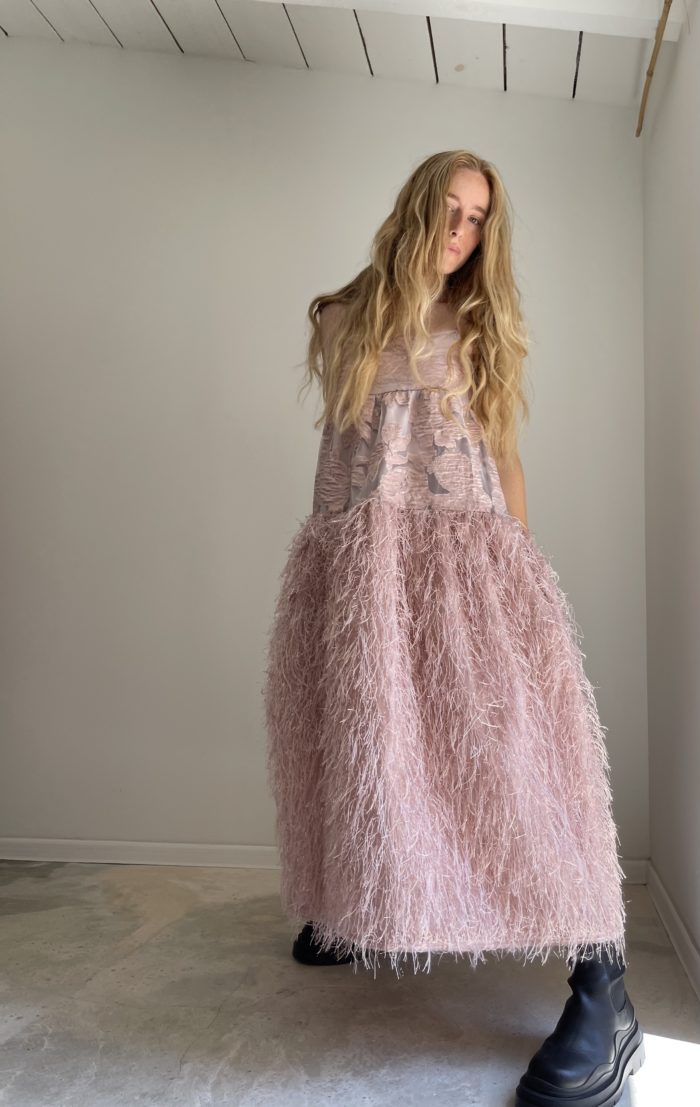 Robe « MINA » dans un sublime tissu scintillant, bustier de la robe sur élastique et doublé dans un tissu rosé, fines bretelles, poches. Une robe élégante et stylée. PIÈCE UNIQUE