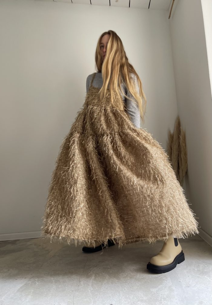 Robe « MINA » dans un sublime tissu scintillant mordoré / bronze, bustier de la robe sur élastique, fines bretelles. Robe entièrement doublée en voile de coton et soie écru. Poches latérales. Une robe élégante et stylée. PIÈCE UNIQUE